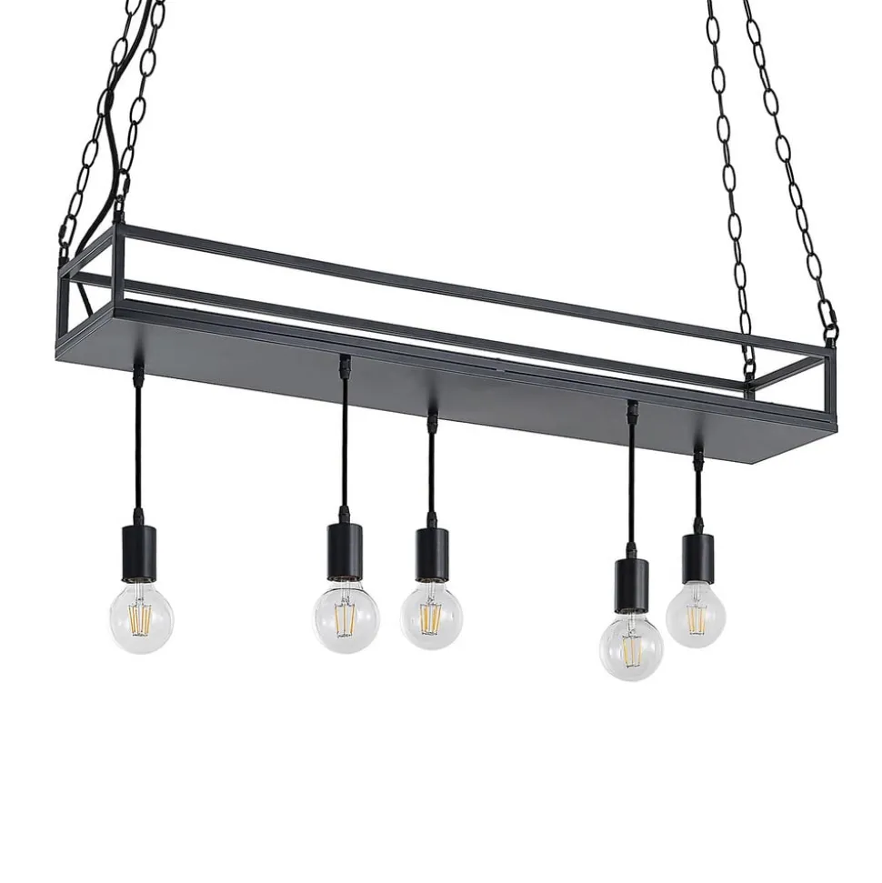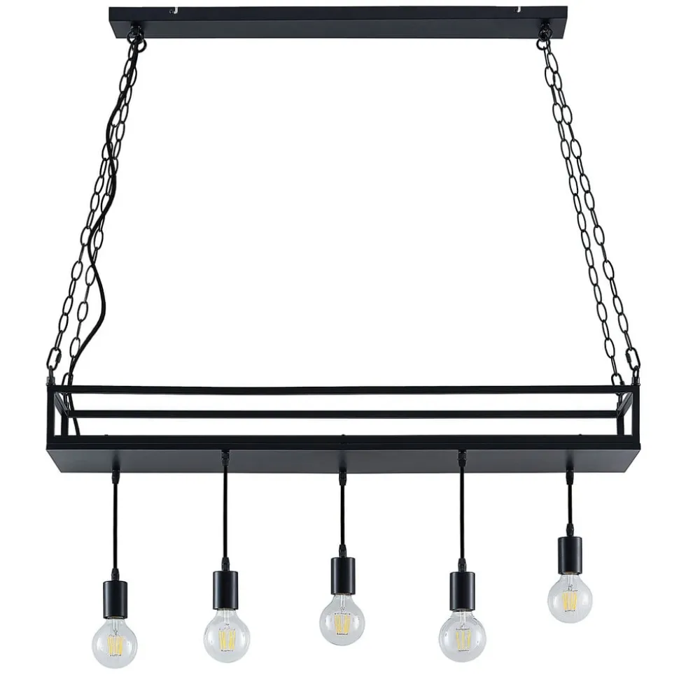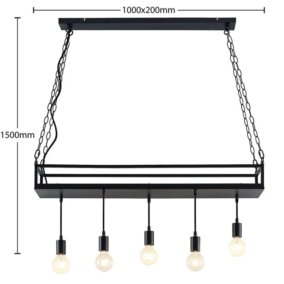 Kirista sort vintage pendellampe med jernstel, kædeophæng, hylde og fem E27-fatninger Denne pendellampe er perfekt til stuen eller køkkenet over et spisebord eller endda over en disk. Lampen har en aflang form og har i alt fem lyskilder, som tilsammen kan give et tilstrækkeligt stærkt lys. På grund af deres særlige rolle i helheden skal de vælges med omhu og se så dekorative ud som muligt, som det er tilfældet med filamentpærer, der er udstyret med LED, men som ligner traditionelle glødepærer, så den nostalgiske charme ved klassisk belysning bevares. Lamperne hænger løst ned i rummet i deres kabler. Den indrammede hylde over pærerne, der er sort som resten og giver plads til en række forskellige ting, fra praktiske til dekorative, er værd at se. En eller to potter med små grønne planter opfylder også deres formål og beriger rummet med frisk luft og dekorativt grønt. Hylden kan holde til en maksimal belastning på 15 kg.