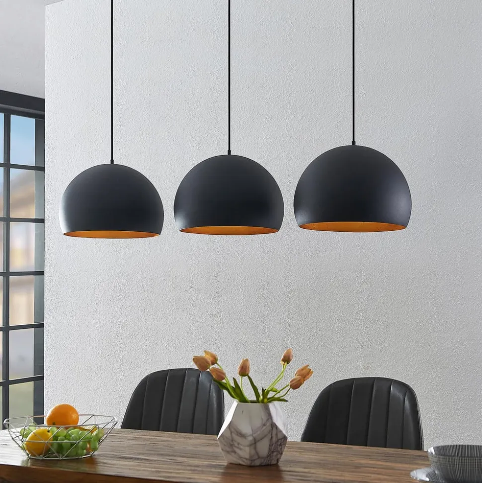 3 lyskilder Tarjei pendellampe til spisestuen med lampeskærme i sort og guld stål Tarjei passer til mange moderne miljøer og er velegnet til belysning af både spiseborde og diske. I begge tilfælde skaber pendellampen et behageligt omgivelseslys, som ikke blænder og virker meget hyggeligt. Bordets overflade får også maksimal lysstyrke, da lyset fra E27-pærerne (medfølger ikke) fokuseres og koncentreres på overfladen. Lampeskærmene, der alle tre har form som en halvkugle, er sorte på ydersiden og har en mat guldfoliefinish på indersiden, hvilket bidrager til særligt varme og indbydende lysforhold. Lampeskærmene har en diameter på 40 cm. De anvendte pærer skal ikke kun se godt ud, men også være topmoderne. Vi anbefaler derfor brug af LED-filamentpærer, som ligner klassiske glødepærer, men som bruger langt mindre strøm og derfor er særligt effektive.