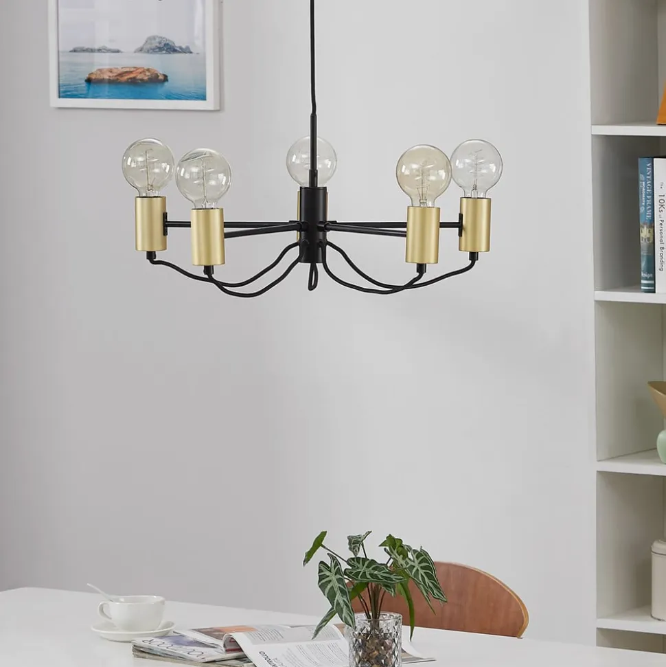 Elegant Prospa lysekrone med fem åbne lyspunkter Denne lysekrone har uden tvivl et meget moderne look og er derfor et meget moderne belysningsobjekt i lysekroneform. Den har ingen skærme, så fokus er direkte på lyskilderne, som derfor er meget fremtrædende og bør vælges med henblik på at skabe det rigtige look. Filamentpærer med effektiv LED-teknologi anbefales, gerne med en lidt større kugleform. Rammen er sort, armene er elegant buede, og fatningerne er hver især omgivet af et element med en dekorativ messingfinish. Prospa-lysekronen er det perfekte valg for alle, der ikke vil gå på kompromis med modernitet eller en sofistikeret lysekrone-stil! Et spisebord i en moderne boligindretning bliver sat i scene på en særlig stilfuld måde.