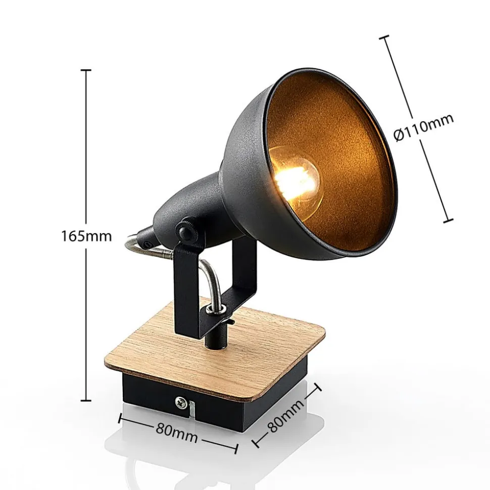 Sort Aylis-spot med krydsfinerpanel for en dekorativ accent Aylis-vægspottets metalskærm har en mat sort finish og har også et industrielt chikt look, da skruer og samlinger pryder det overordnede design, hvilket giver det et mere rustikt udseende. Det betyder også, at lysets retning kan justeres efter ønske, da skærmen kan drejes og svinges. Den lyse krydsfinerplade til væg- eller loftmontering er en iøjnefaldende detalje, der giver spottet et mere naturligt look.