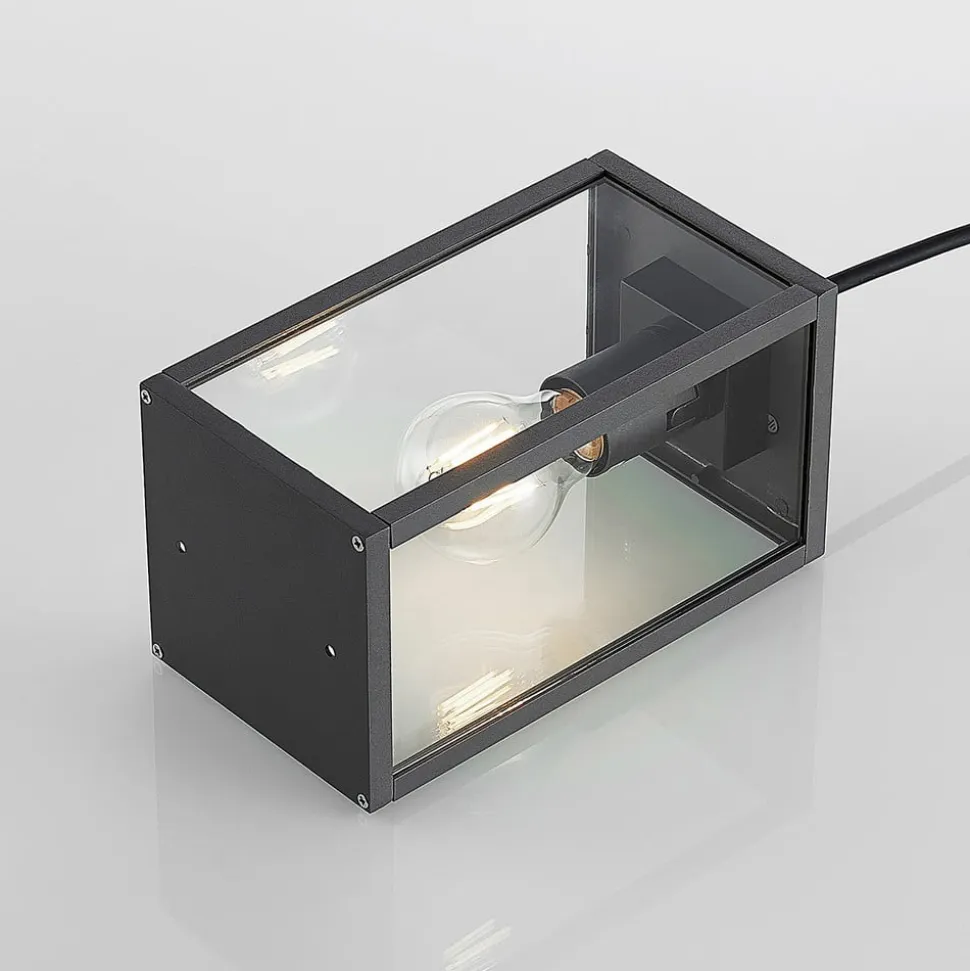 Filimon kantet udendørs hængelampe med klare glasindsatser og mørkegråt aluminiumshus Filimon er ideel til stilfuld belysning af overdækkede udendørsarealer, som det er tilfældet med nogle terrasser og altaner. Hængelampens grundform er firkantet med et helt lineært design, hvilket gør Filimon nem at kombinere med moderne stilarter. Indsatser i klart glas gør ikke kun designet mere elegant, men bidrager også til større robusthed, fordi hængelampen til udendørs brug er bedre forseglet med dem, så den overholder kapslingsgrad IP44 og kan modstå fugt og støv godt. Den E27-lampe, der skal bruges, er også tydeligt synlig udefra, så den bør vælges, så den matcher det overordnede look. Dette taler for at bruge rustikke eller filamentpærer, som i dag normalt drives med energibesparende LED-filamentpære.