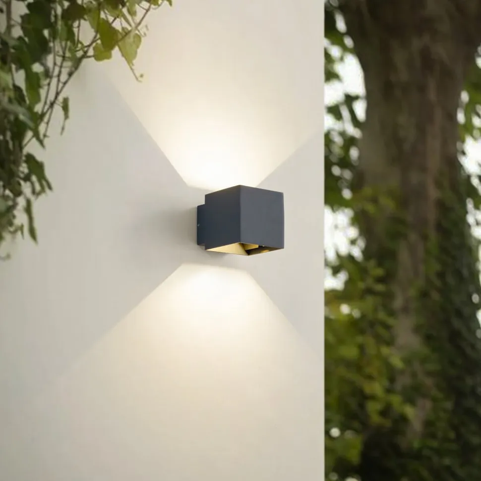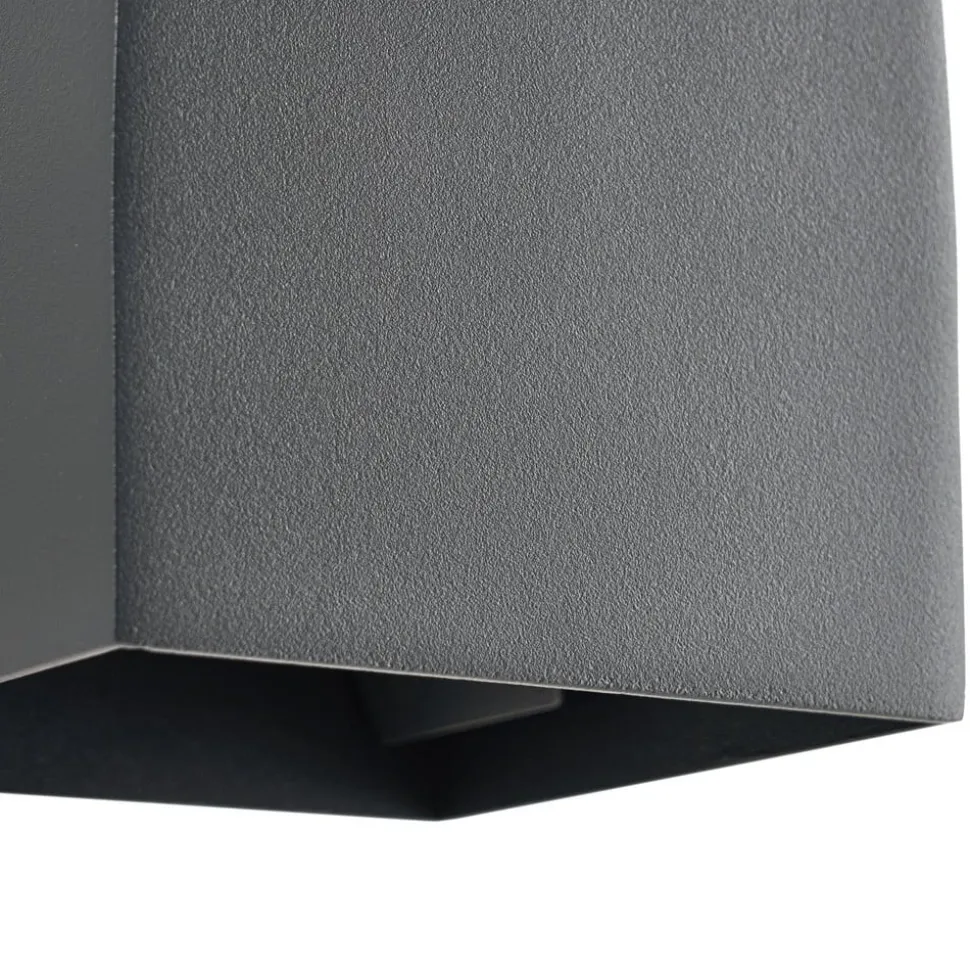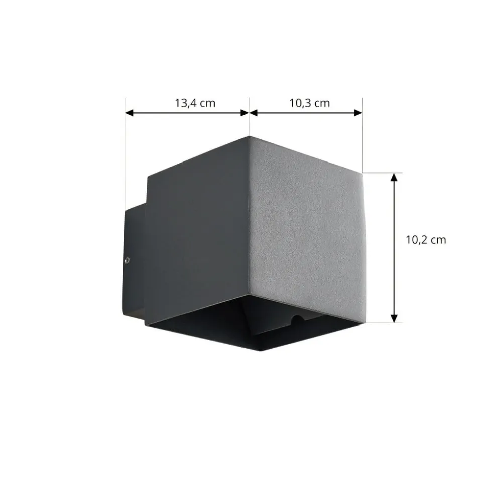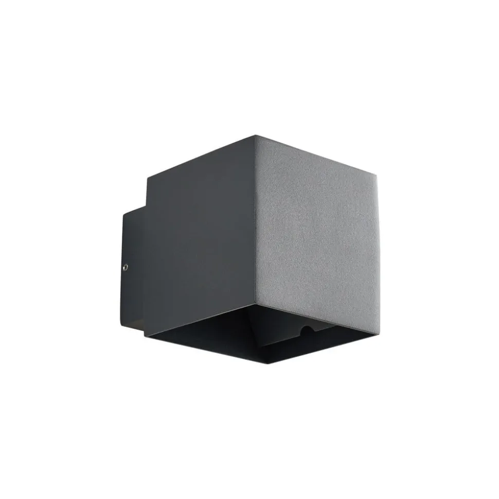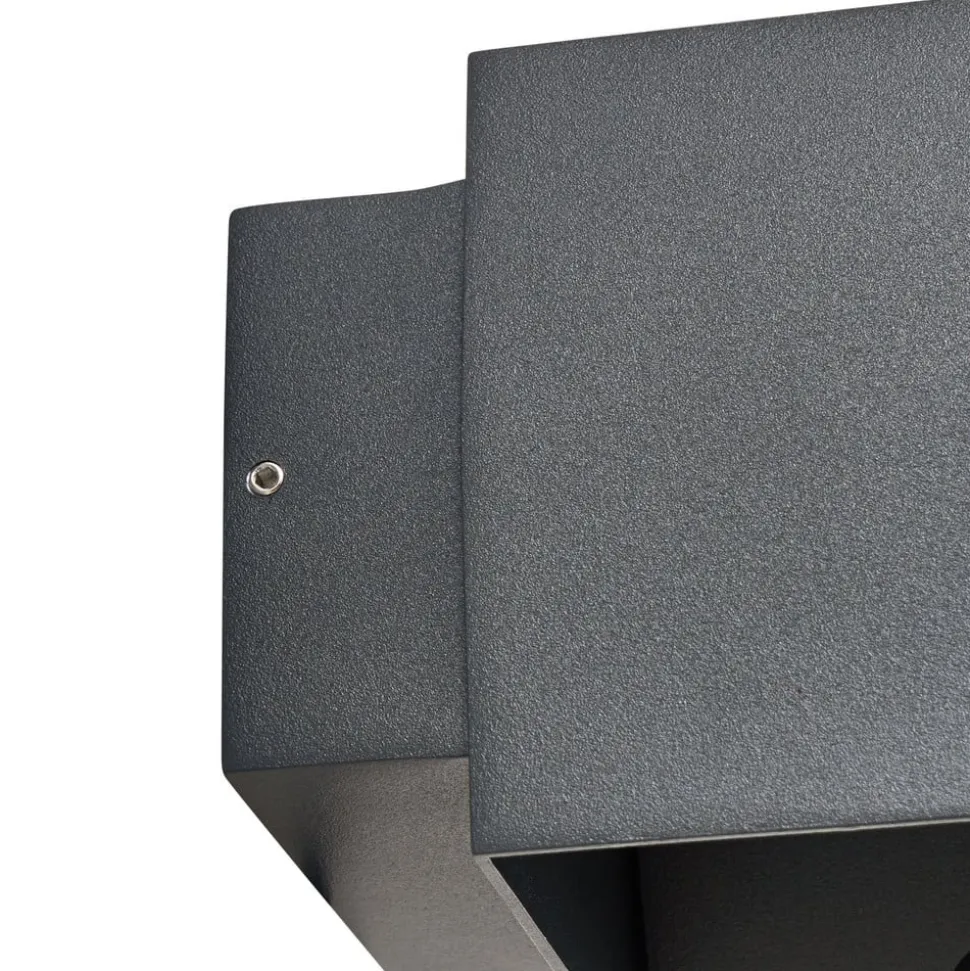Geometrisk formet Esani udendørs LED-væglampe i mørkt look – justerbar lysudsendelse Udstyret med en kapslingsgrad på IP54 er denne smukke lampe optimalt beskyttet mod vind og vejr, hvilket gør den ideel til indgangspartiet eller terrassen. De permanent installerede LED’er udsender et varmhvidt lys, der har en blød og indbydende effekt og skaber smukke lysaccenter på væggen. Lysudstrålingsvinklen kan også justeres individuelt i toppen og bunden. Esani udendørs LED-væglampen har et kubisk design og er lavet af trykstøbt aluminium. Dens antracitfarvede overfladefinish har en trendy og markant effekt og er særlig effektiv i moderne omgivelser.
