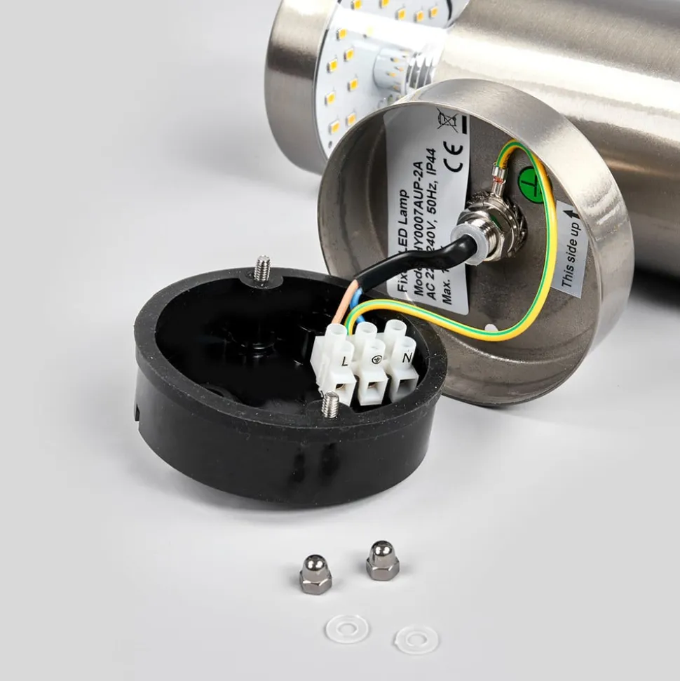 Lanea er en meget moderne lampe, der overbeviser med sin rustfri ståloverflade. Overfor de varmhvide LED’er er der trappetrinsformede reflektorpærer med en sølvblank overflade, der individualiserer lysbilledet og får det til at fremstå mere effektfuldt. Den grundlæggende form på den udendørs LED-væglampe er cylindrisk, og de fast monterede pærer har en særlig god energieffektivitet, hvilket betyder: klart lys, lavt strømforbrug.