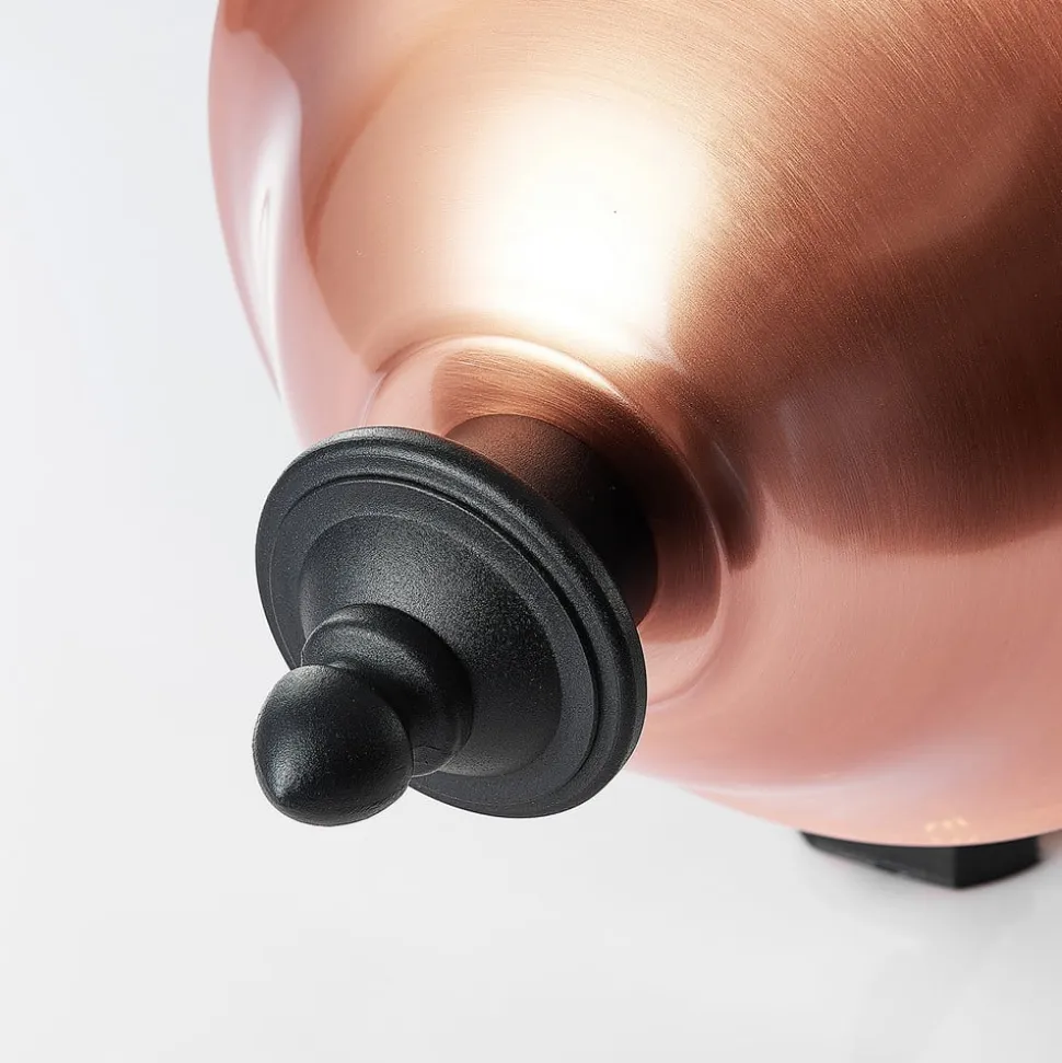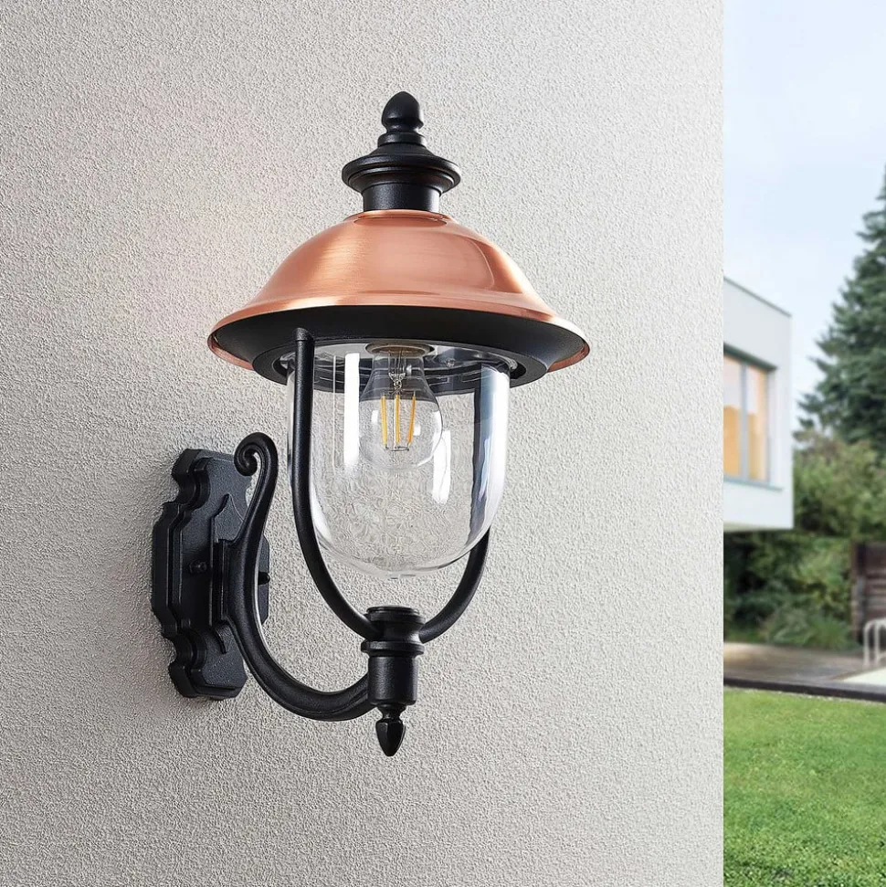 Den formskønne udendørs væglampe Clint består af et sort stel i aluminium, som kontrastfuldt suppleres med en kobberdel. Lampeskærmen ligner en stående lanterne, der er udstyret med et tag af kobber og en gennemsigtig skærm over E27-fatningen.