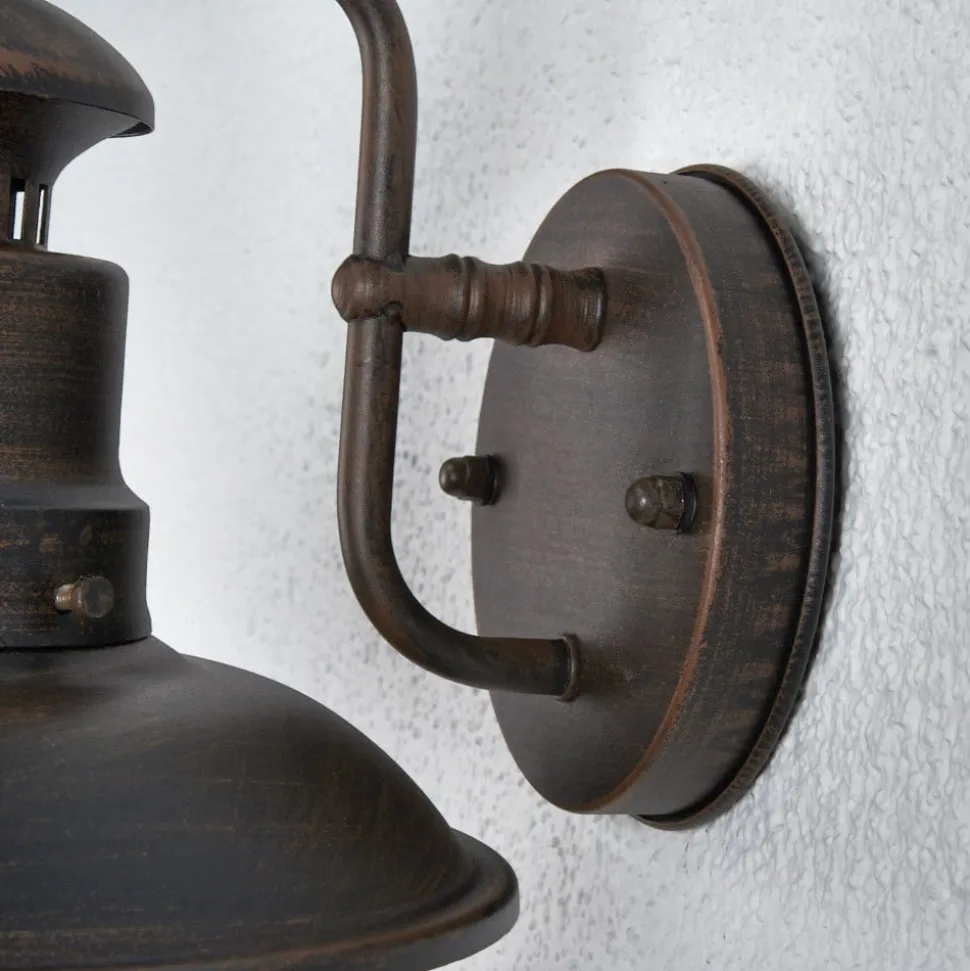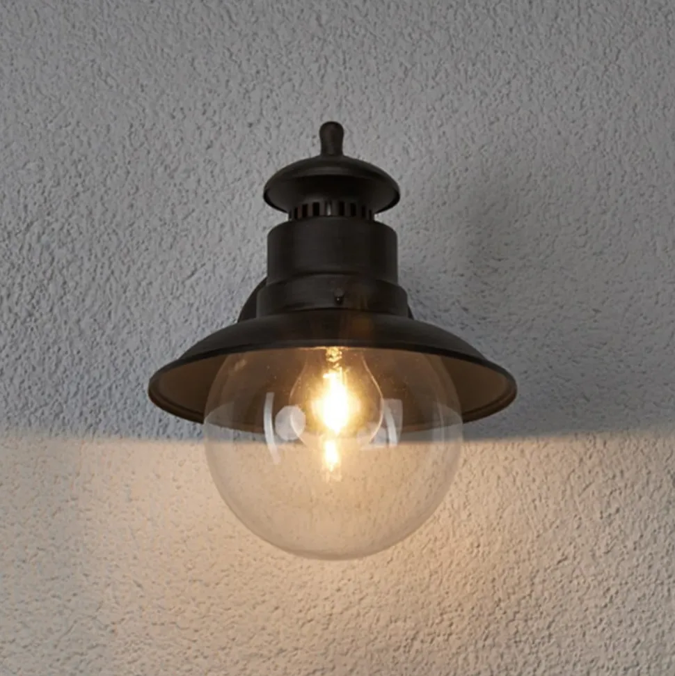 Rustikt udseende Eddie udendørs væglampe med kugleformet glasdæksel Det rustikke præg, der udgår fra Eddie udendørs væglampe, kan ikke ignoreres. Det skyldes på den ene side den særlige form, den er designet i, men også den rustfarvede lakering af rammen. Under pæren er der et beskyttelsesdæksel af klart glas, som afrunder designet harmonisk og i kombination med kapslingsgraden IP44 beskytter mod indtrængen af snavs og vand. En dekorativ væglampe til udendørs brug, der altid giver den nødvendige orientering i mørket.