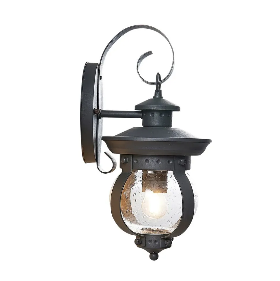 Farley udendørs væglampe i en dekorativ lanterneform Designet af Farley udendørs væglampe minder lidt om svundne tider. Lampeskærmens design ligner en pæreformet lygte, som hænger nedad og er sikkert fastgjort til væggen med en plade. Den pære, der skal bruges, er indrammet af en glasskærm, der er dekorativt udsmykket med små luftbobler. Disse skaber også en magisk lyseffekt, når lyset tændes. Det gennemsigtige glas gør, at dekorative filamentpærer, som fås som tilbehør, virkelig kommer til deres ret. Farley er en moderne udendørs væglampe, som ser godt ud ved f.eks. indgange til huse eller på terrasser, verandaer eller balkoner. Takket være jernrammen og vægpladen i aluminium er Farley udendørs væglampe også robust.