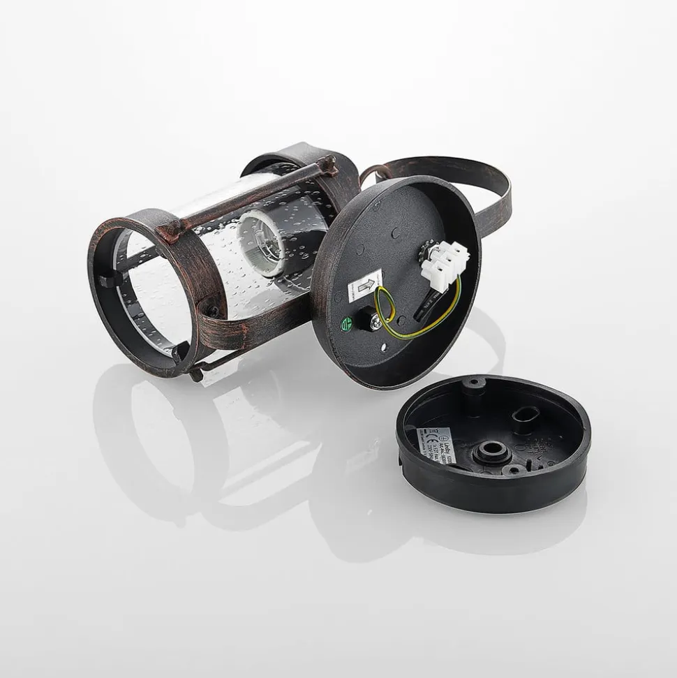 Farly – nostalgisk udendørs væglampe med rustbrunt look Den er blikfanget på enhver facade – den udendørs væglampe Farly med sit nostalgiske design. En rustbrun aluminiumsramme med legende elementer understøtter en lampeskærm af bobleglas. Den omslutter den indvendige E27-fatning, som er ideel til dekorative filamentpærer. Lyset fra Farly udendørs væglampe skinner hele vejen rundt og giver en meget behagelig glød og tilstrækkelig orientering i mørket takket være det boblede glas. Som udendørs væglampe er Farly ideel til belysning af facader. Armaturet er også ideelt til indgangspartier eller som dekorativ udendørslampe på altaner og terrasser.