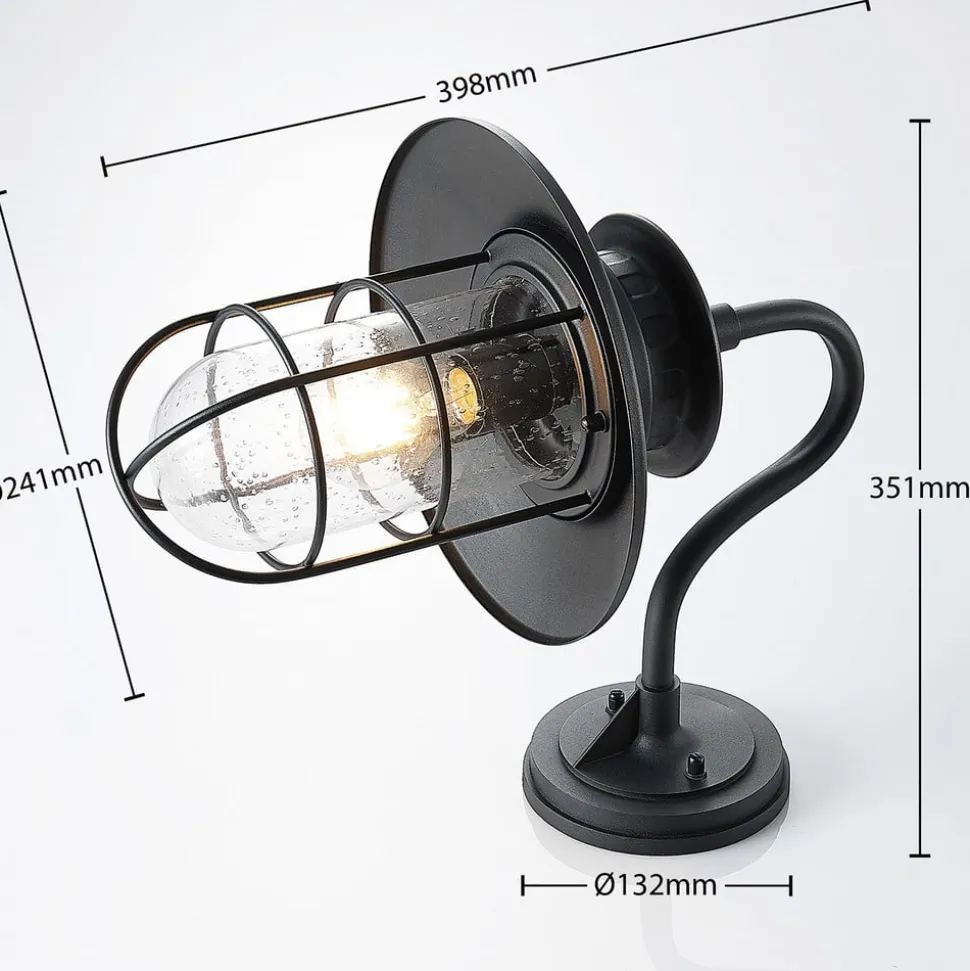 Nostalgisk Kyan udendørs væglampe i bueform Den smukt formede Kyan udendørs væglampe ser godt ud udendørs ved husindgange, på terrasser eller verandaer. Med sin buede form og beskyttende glaskrop med metalgitter ser den særlig harmonisk ud på ældre bygninger. Det klare glas, som kan indeholde små indesluttede luftbobler, giver et klart udsyn til pæren. Brug af dekorative filamentpærer eller retrofitpærer kan yderligere forbedre armaturets nostalgiske effekt.