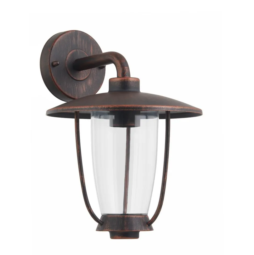 Satish udendørs væglampe med lanterne-look – den markante jernkammerat til udendørs brug Denne væglampe er et fremragende valg til en hyggelig udendørs belysningsoplevelse. Den udendørs væglampe kan dæmpes efter eget ønske med en ekstern lysdæmper (medfølger ikke) og har en IP44-beskyttelsesgrad, hvilket betyder, at den er beskyttet mod indtrængen af faste fremmedlegemer med en diameter på mere end 1 mm og vandsprøjt. Dens enestående design gør den til en behagelig tilføjelse til belysningskonceptet i ethvert udendørs område. Den udendørs væglampe i farven kobber oplyser dit interiør med en stemningsfuld lyskilde. Den smukke lampe har et design, der er let at kombinere, og som giver din indretning en fantastisk atmosfære. Den udendørs væglampe er lavet af jern og plast og supplerer dit udendørs område takket være sin antikke stil. Du kan bruge en lyskilde med E27-sokkel i denne udendørs væglampe. Lampen er perfekt til at afrunde udseendet på alle udendørs møbler. Denne udendørs væglampe udsender et hyggeligt og indbydende lys, som skaber den perfekte stemning i dit udendørs område.