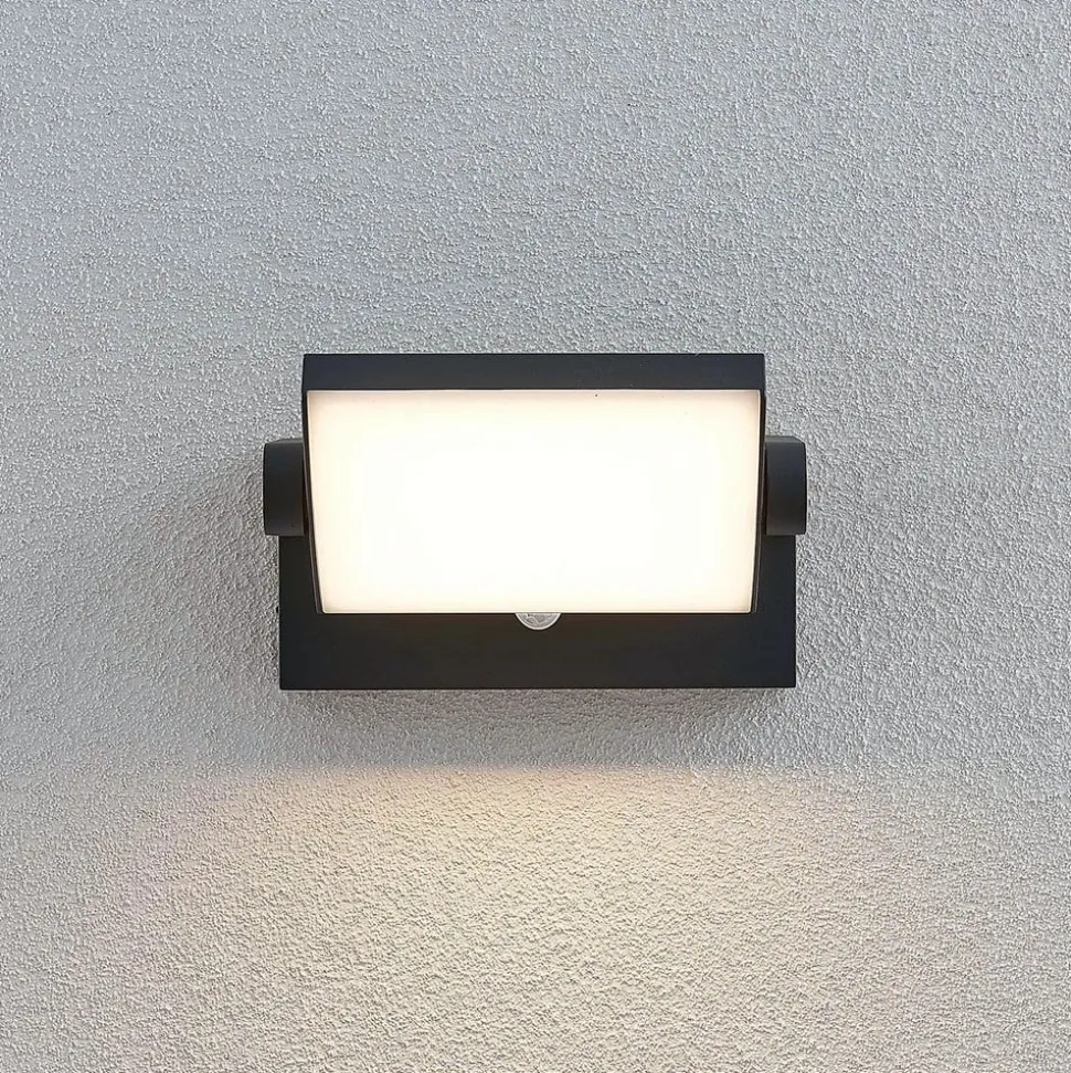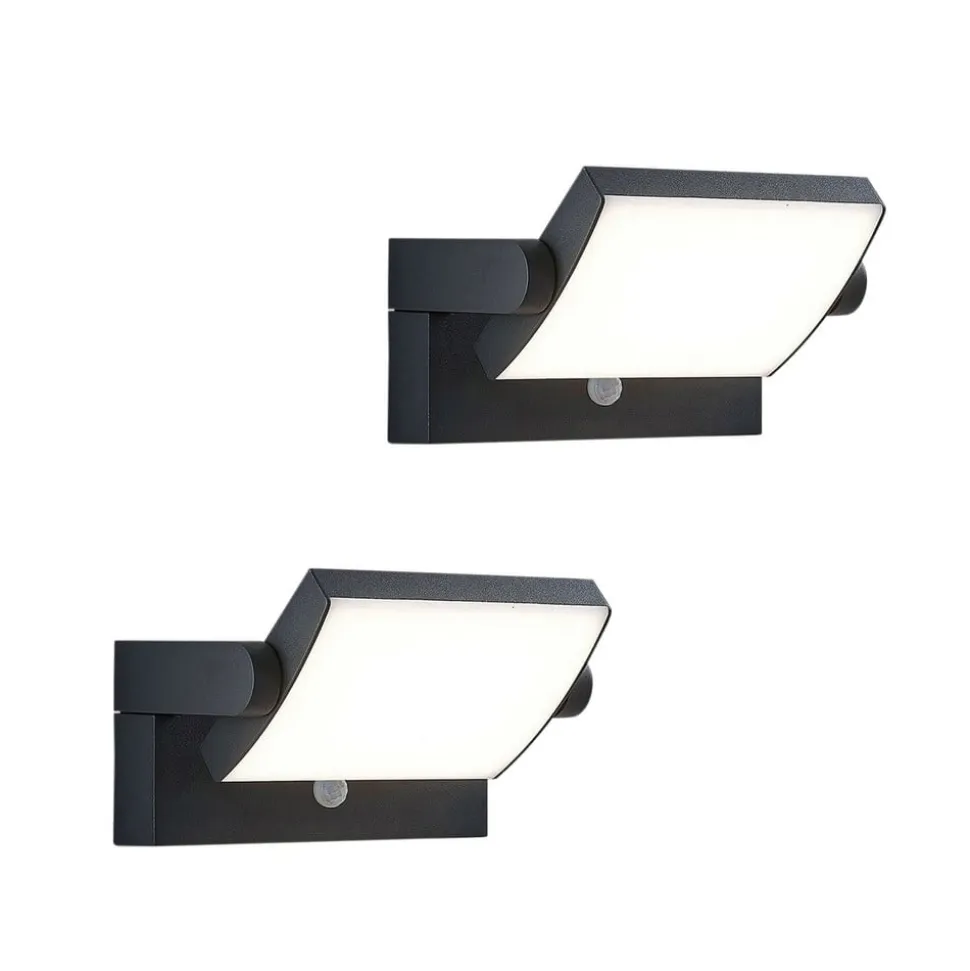 sæt med 2: Sherin – udendørs væglampe med bevægelsessensor Den udendørs væglampe Sherin har et moderne, lineært udseende. Det særlige HighLight er det flade, kantede lampehoved, som kan drejes op til 340 grader for at give både direkte og indirekte lys. Sherin fås i en praktisk dobbeltpakke, og den indbyggede bevægelsessensor bør også nævnes. Sensoren er placeret i den nederste del af den mørkegrå ramme og registrerer alle bevægelser inden for en rækkevidde på 4 til 6 meter og en registreringsvinkel på 100 grader. Belysningstiden kan indstilles fra 5 sekunder til 6 minutter.