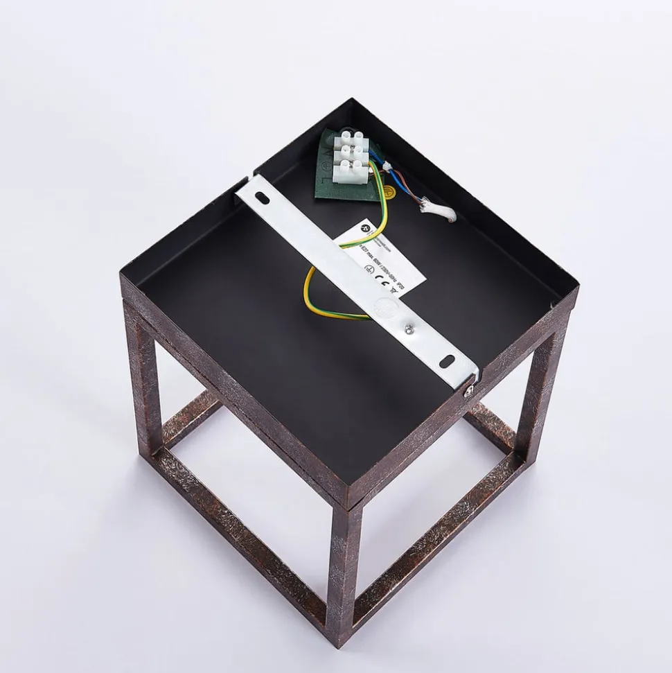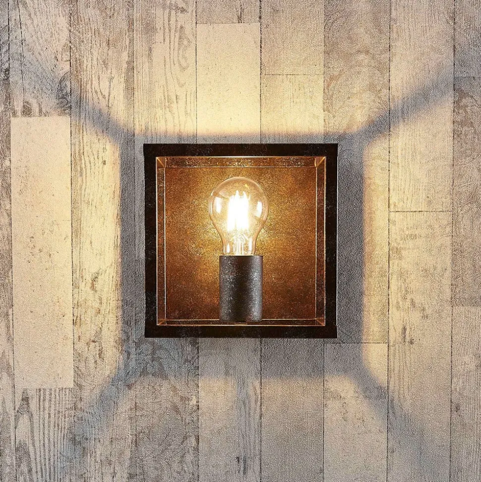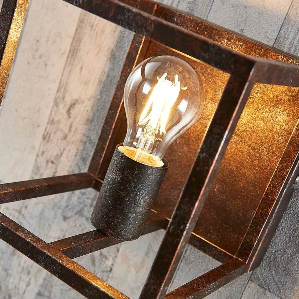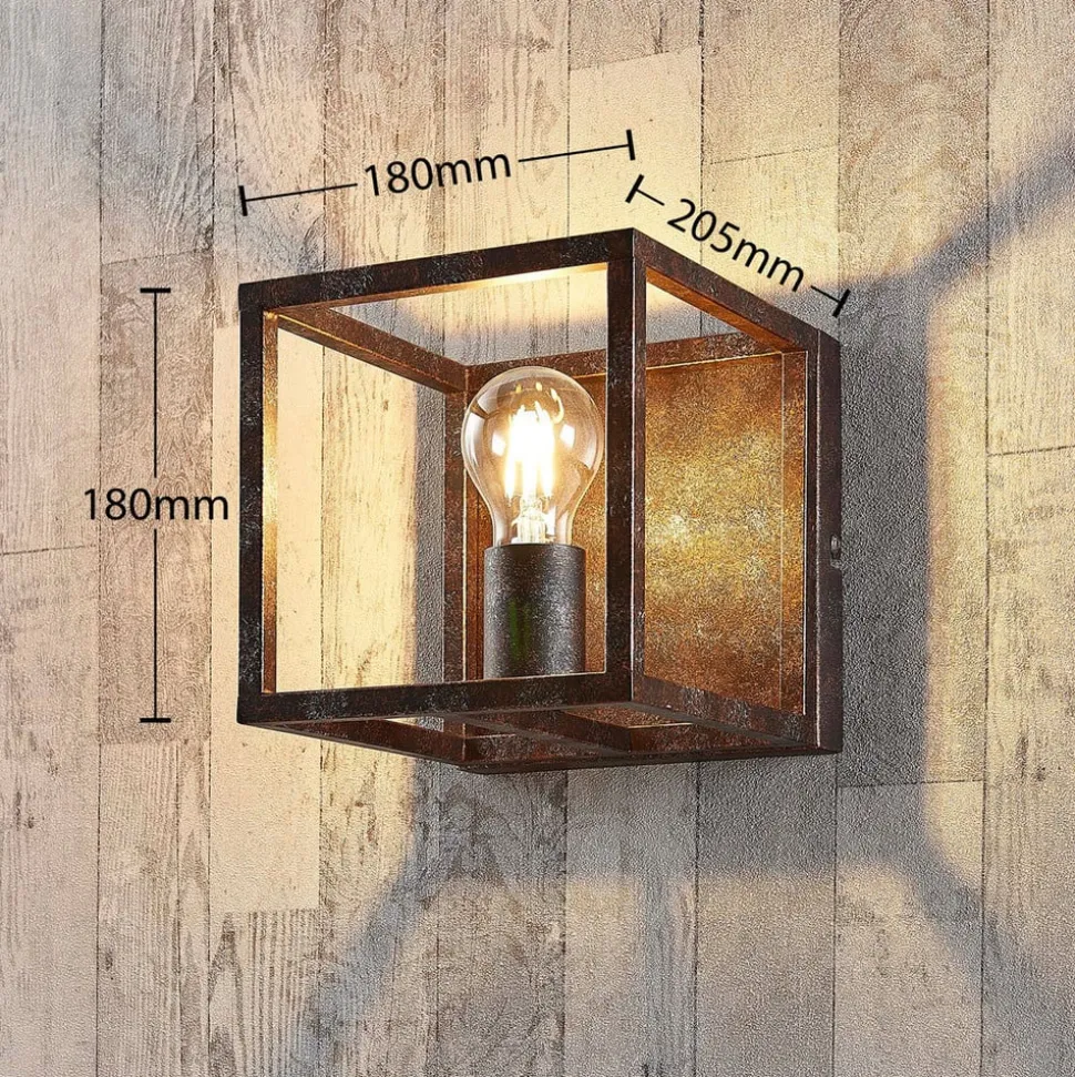Elegant Emin væglampe med rustfarvet finish og kantet metalramme Emin er et meget attraktivt belysningsobjekt, der giver pæren stor visuel frihed. Filamentpærer eller lamper med et rustikt look bør bestemt prioriteres, da de supplerer væglampens nostalgiske udseende perfekt og understreger dens stil.