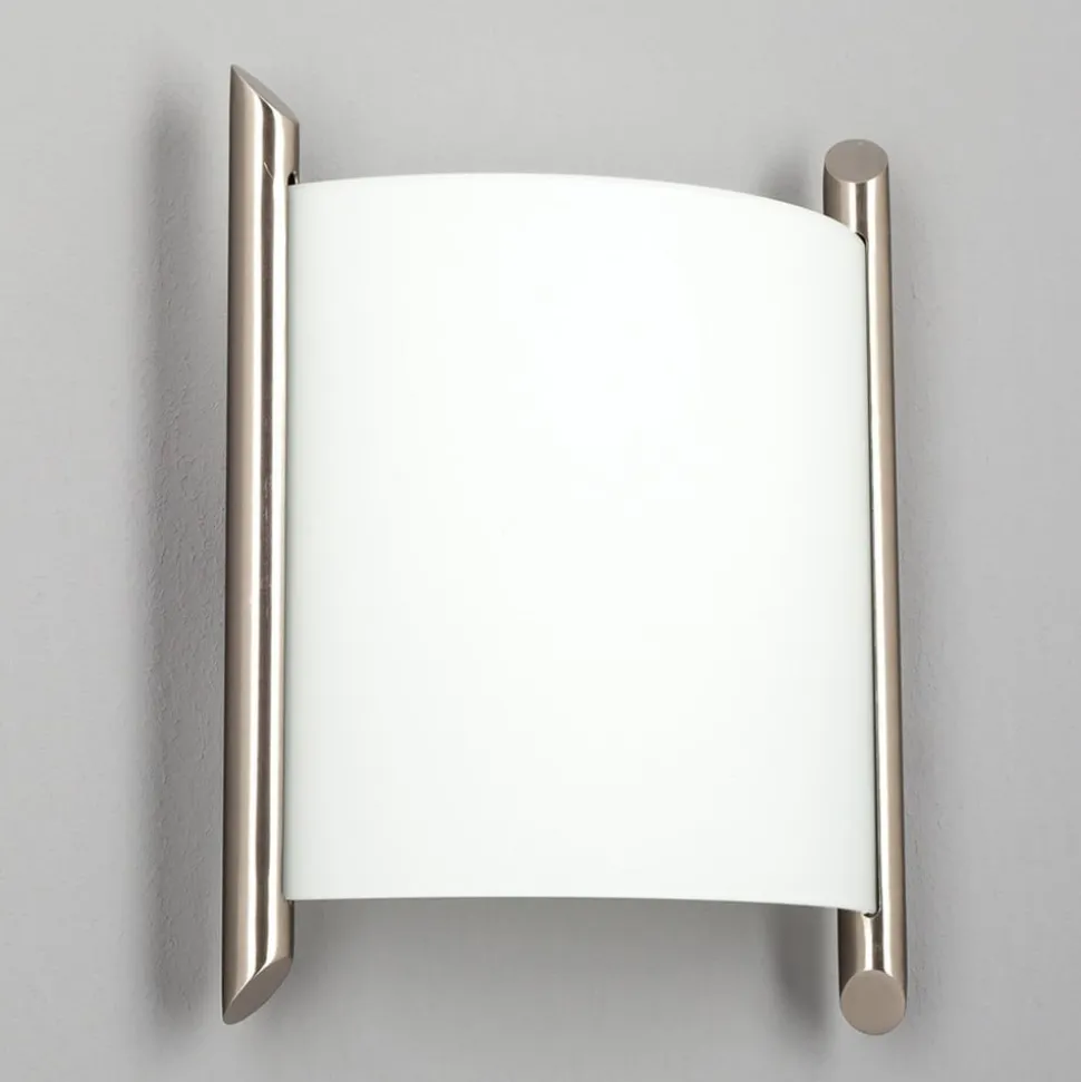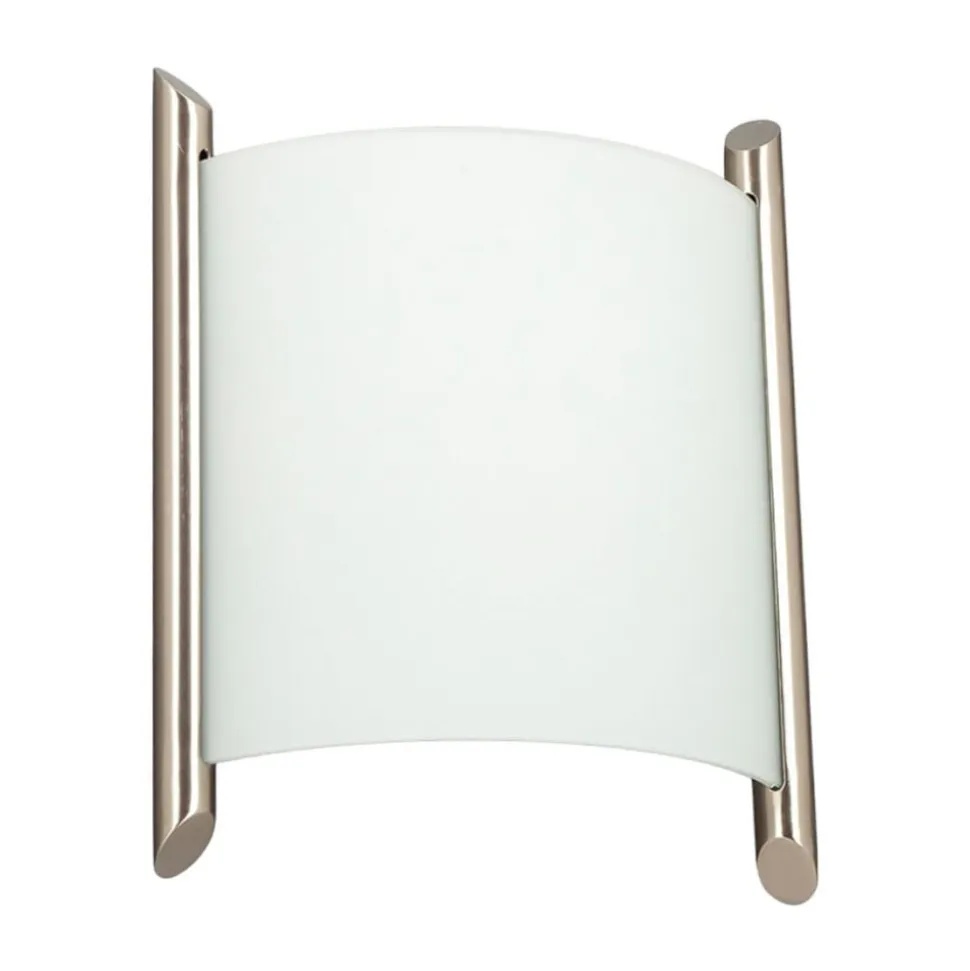 Filippa kantet væglampe af glas og metal Denne væglampe har et meget attraktivt udseende, glasskærmen er let buet og suppleres på siden af to metalelementer med en mat nikkelfinish. Når Filippa er monteret på væggen, ser den derfor meget elegant og naturligt moderne ud. Den satinerede glasindsats skaber en blød og varm lysfordeling, hvor der stort set ikke er grænser for valget af lyskilde, da E27-fatningen giver mulighed for at bruge både gløde- og halogenpærer samt de mere effektive energibesparende og LED-pærer.