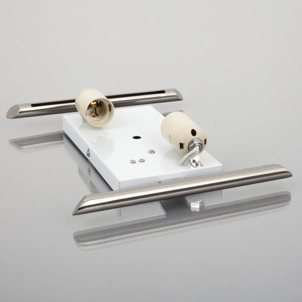 Filippa væglampe med en hyggelig lyseffekt To metalstivere med en satineret nikkelfinish er placeret på siden af den satinbehandlede glasskærm på Filippa væglampen. De holder den buede glasskærm, som er åben foroven og forneden. Der er ingen tvivl om, at det lys, der skabes, er utroligt hyggeligt. Denne væglampe i glas kan bruges til effektivt at oplyse alle slags opholdsrum – fra stuen til gangen til soveværelset – og skabe en hyggelig atmosfære.