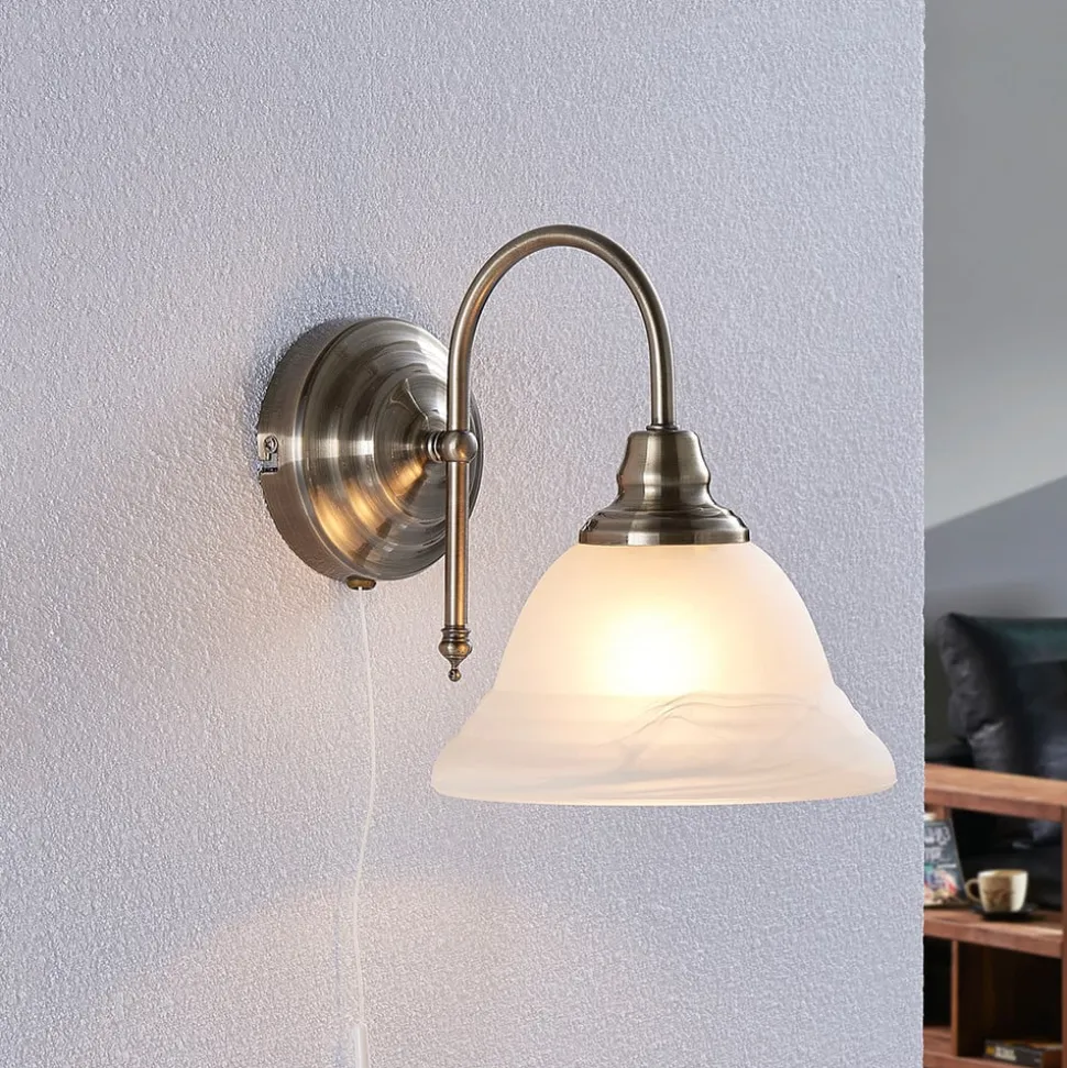 Hanna væglampe med trækkontakt i klassisk stil Væglampens ramme og skærm arbejder harmonisk sammen og gør Hanna til en lyskilde med et attraktivt udseende. Rammen, som består af et vægbeslag og en buet arm, har et nostalgisk udseende med sin antikke messingfinish, og skærmen har den typiske alabast-look tåge i glasset, som ikke bare kommer til sin ret, når den er tændt, men ser smuk ud, selv når væglampen stadig er slukket. For at tænde den skal du blot trække i den permanent installerede trækkontakt, og den valgte pære vil lyse op.
