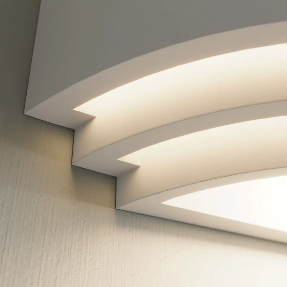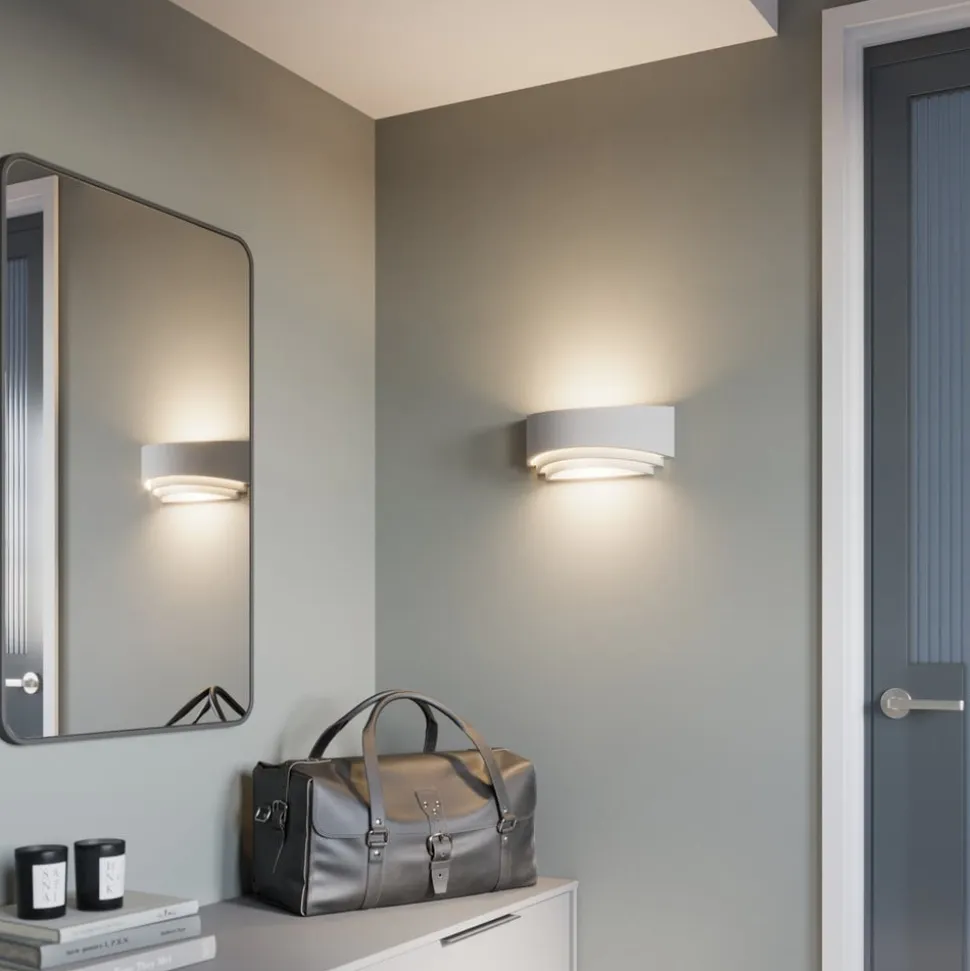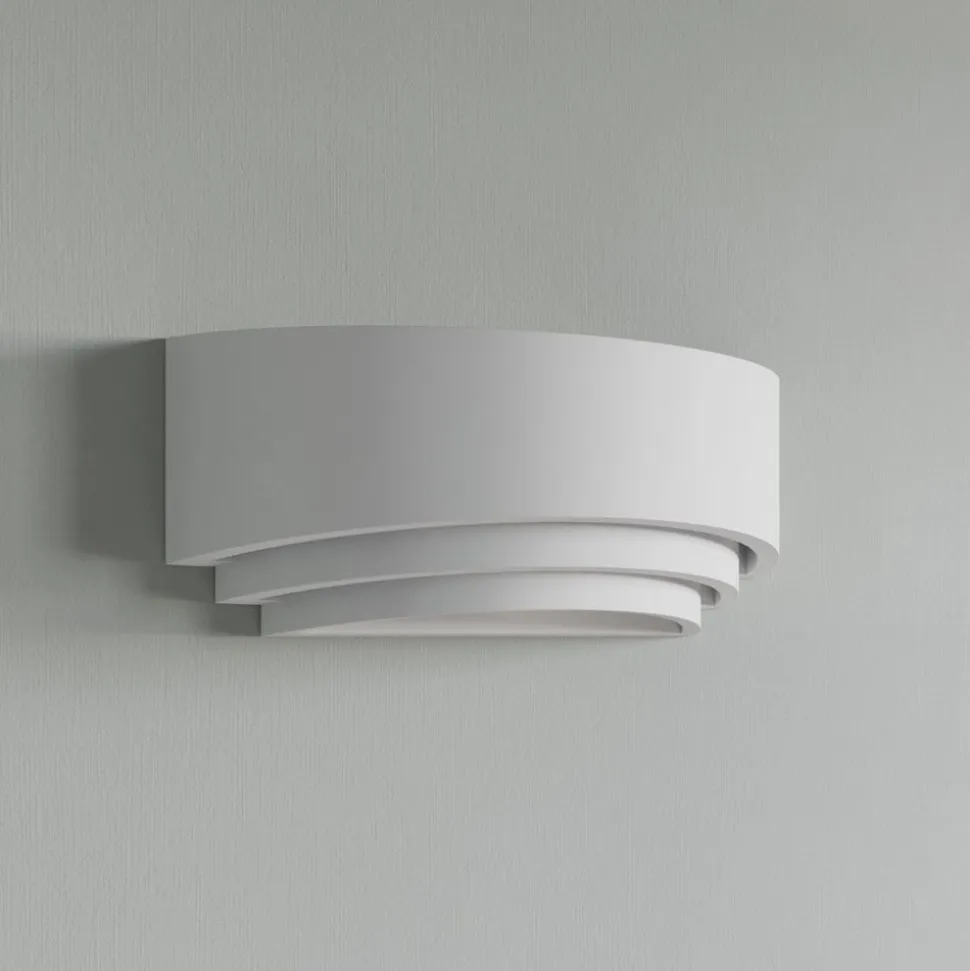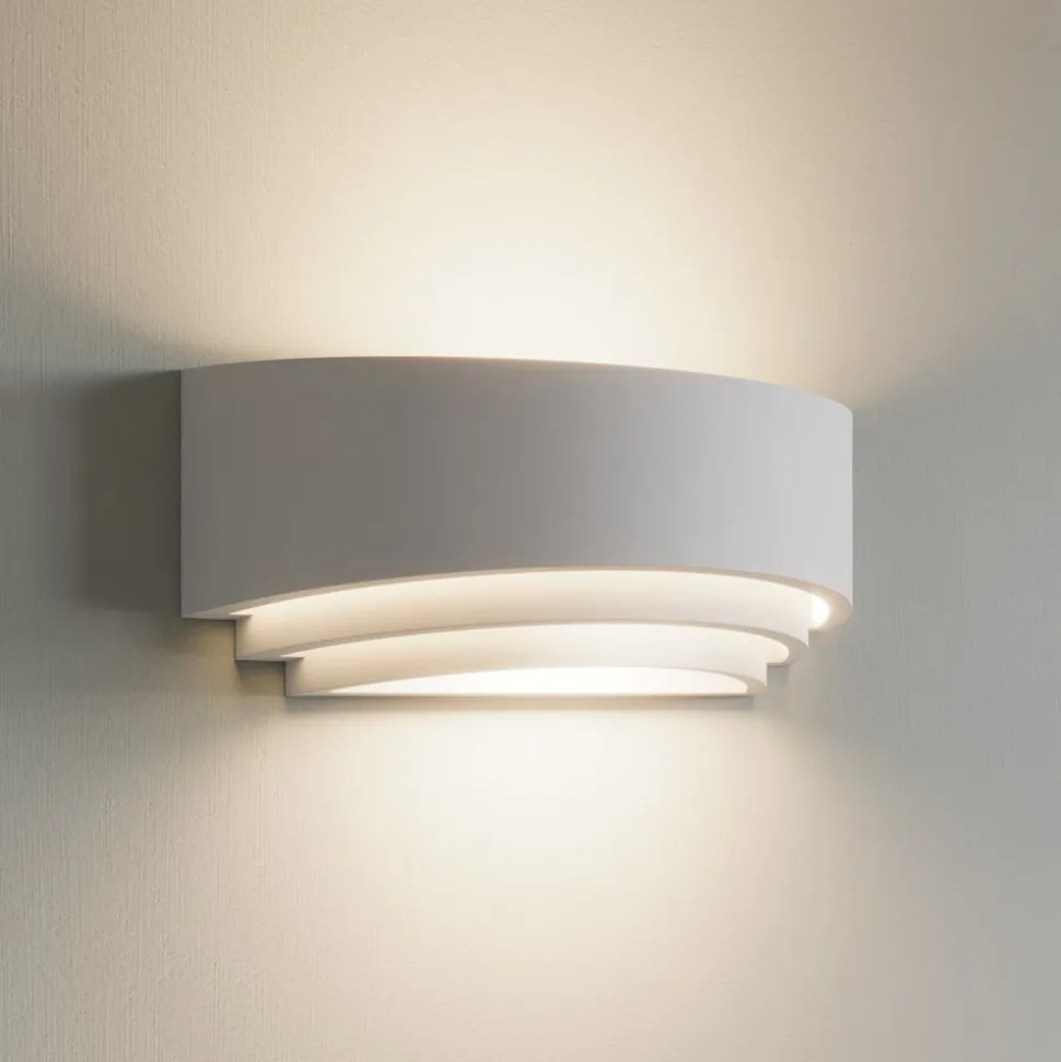 Lucien tredelt, halvcirkelformet væglampe af hvid gips Lucien er en vidunderlig lyskilde til hyggelig belysning i opholdsrum. Lampeskærmen har en halvcirkelformet form, er åben i toppen og bunden og er sat i tre niveauer, hvilket skaber særlige lyseffekter. Fordi pæren ikke er direkte synlig, er lyset blændfrit og meget hyggeligt. Denne effekt kan forstærkes ved at vælge en passende lyskilde, da LED-pærer fås i mange varianter, f.eks. med en ekstra varmhvid lysfarve eller integreret dæmpningsteknologi, der gør det muligt at regulere lysstyrken i flere trin ved hjælp af vægkontakten. Gipskroppen ser stilfuld og harmonisk ud med sin hvide overflade, men det er også muligt at tage en pensel og maling og bruge den til at skabe et individuelt overfladedesign i form af en ensfarvet maling eller et smukt motiv. Der er virkelig mange måder at være kreativ på og integrere lyset i rummet.