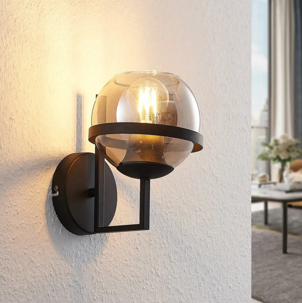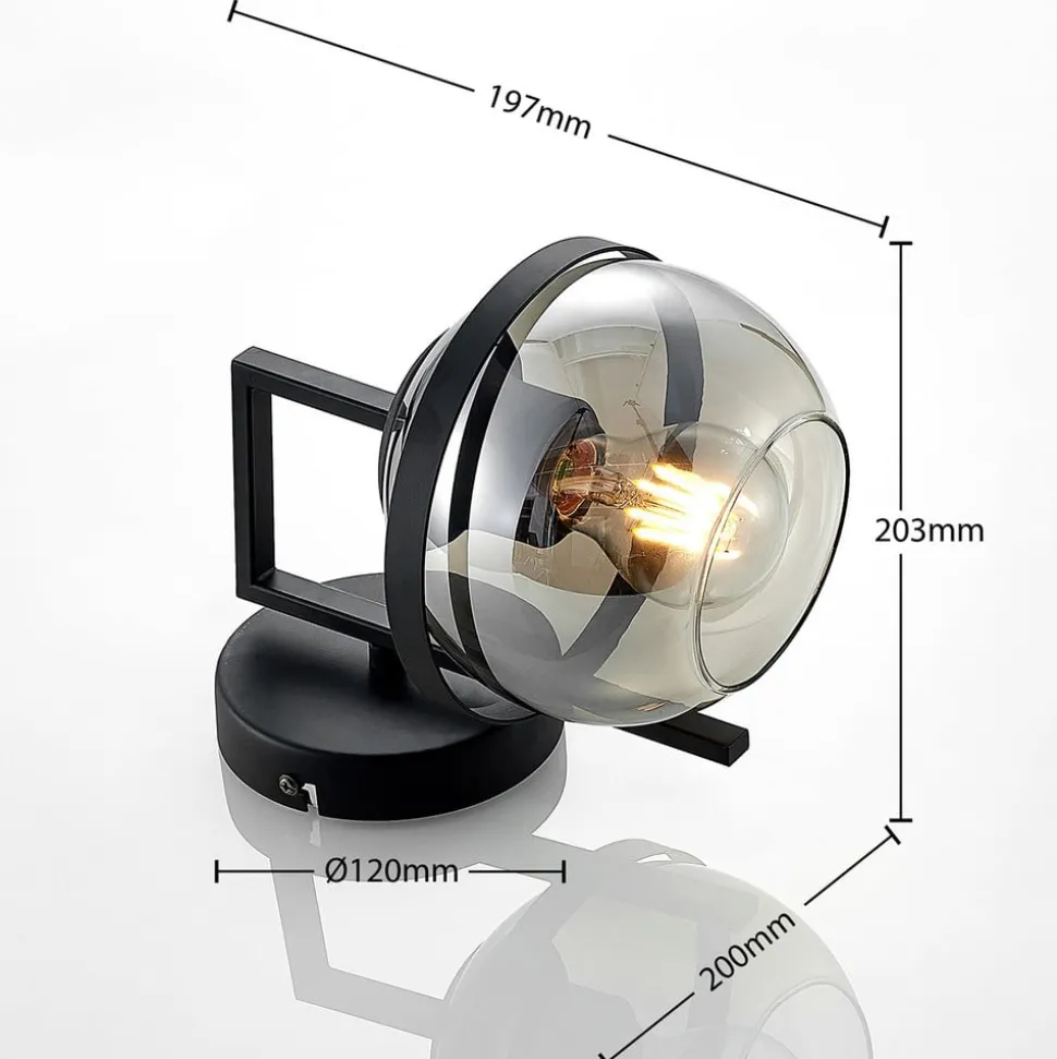 Marinka væglampe med sfærisk røgfarvet glasskærm i klart look Marinka har et elegant, lidt rustikt design og giver et pålideligt lys som indendørs væglampe. Rammen med den ringformede metalramme, der holder lampeskærmen, er lavet af metal og har en mat sort finish. Glasset er derimod klart og har en røgfarvet nuance. Der kan bruges E27-pærer efter eget valg, og der kan også bruges effektive LED-pærer med glødetrådsteknologi, så de ligner den gode gamle glødepære så meget som muligt.
