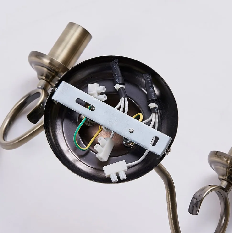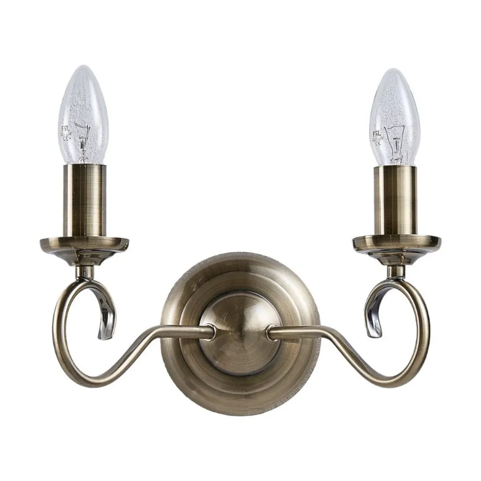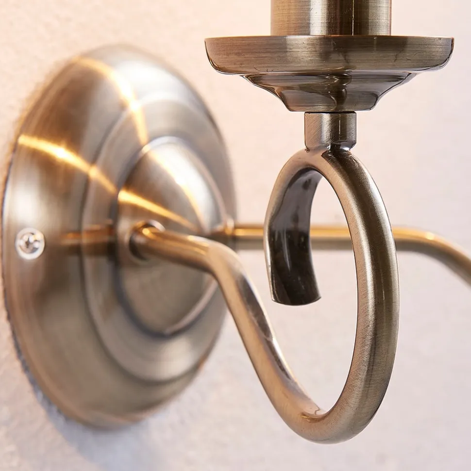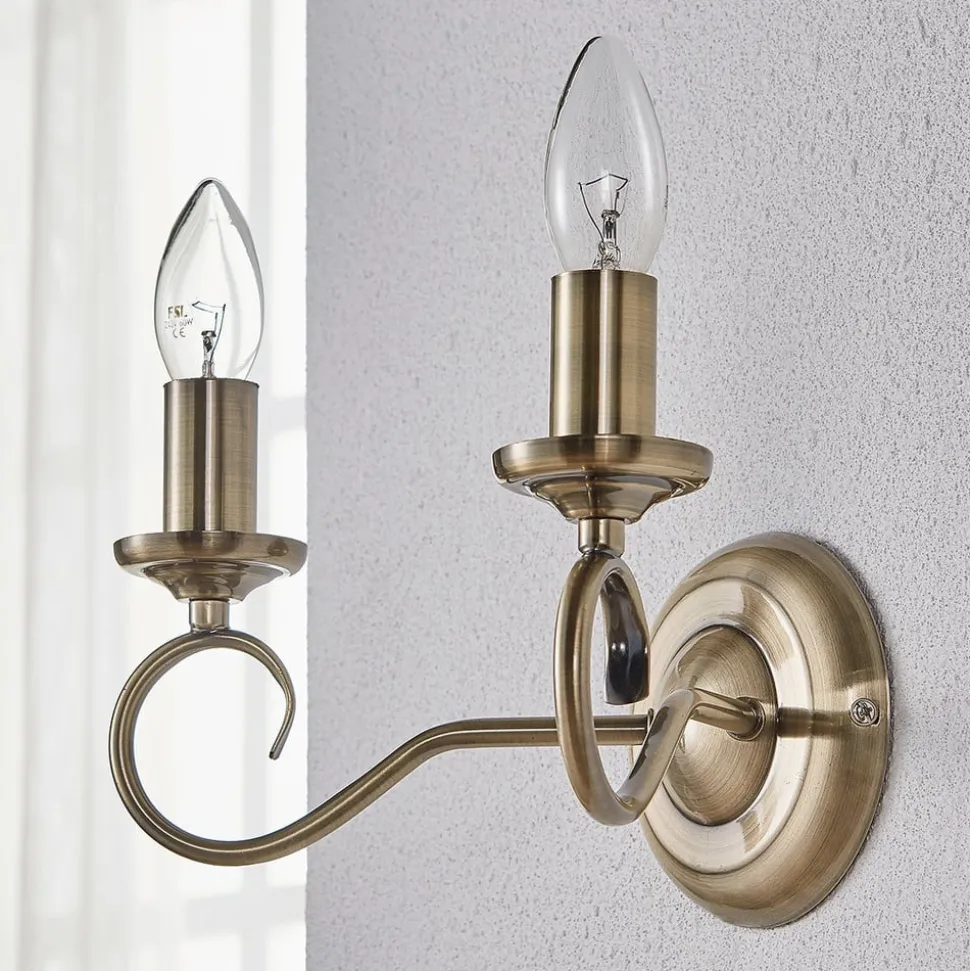 Marnia væglampe i sublim stil Denne æstetiske væglampe er umiskendeligt lavet i stil med klassiske lysekroner, og derfor udstråler den stor storhed. De to lyskilder peger opad, og de filigrane arme er let snoede. Hele rammen er lavet af metal, som har en antik udseende gammel messingfinish og derfor kan kombineres godt med antikke møbler.