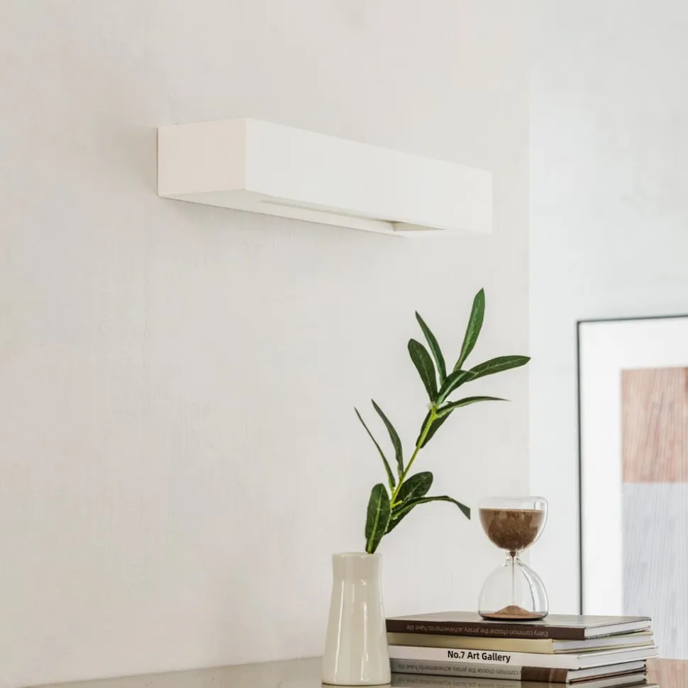 Matteo kantet væglampe med hvid gipsoverflade, kan males Matteo ligner en hvid mursten, og først ved andet øjekast er man klar over, at den skjuler en dekorativ væglampe, der giver indirekte lys. I bunden er der en diffusor af satineret glas, som sikrer en mere jævn fordeling af lyset, mens forsiden er lavet af uigennemsigtig gips. Væglampen kan monteres med lyskilder med E14-sokkel og er ideel til brug i korridorer eller trappeopgange, dvs. områder i hjemmet, der er præget af hyppig passage, men hvor målrettet belysning ikke er det vigtigste kriterium. Takket være armaturet med 2 pærer opnås en behagelig grundlysstyrke, selv når kun væglampen er tændt. Den vigtigste egenskab ved gips som overflade er, at det er muligt at ændre farven bagefter eller at male den med individuelle motiver eller illustrationer – for alle dem, der ikke vil gå glip af et individuelt præg, selv med belysning! Til dette formål følger der sandpapir og handsker med lampen for at sikre en optimal overfladebehandling før priming.
