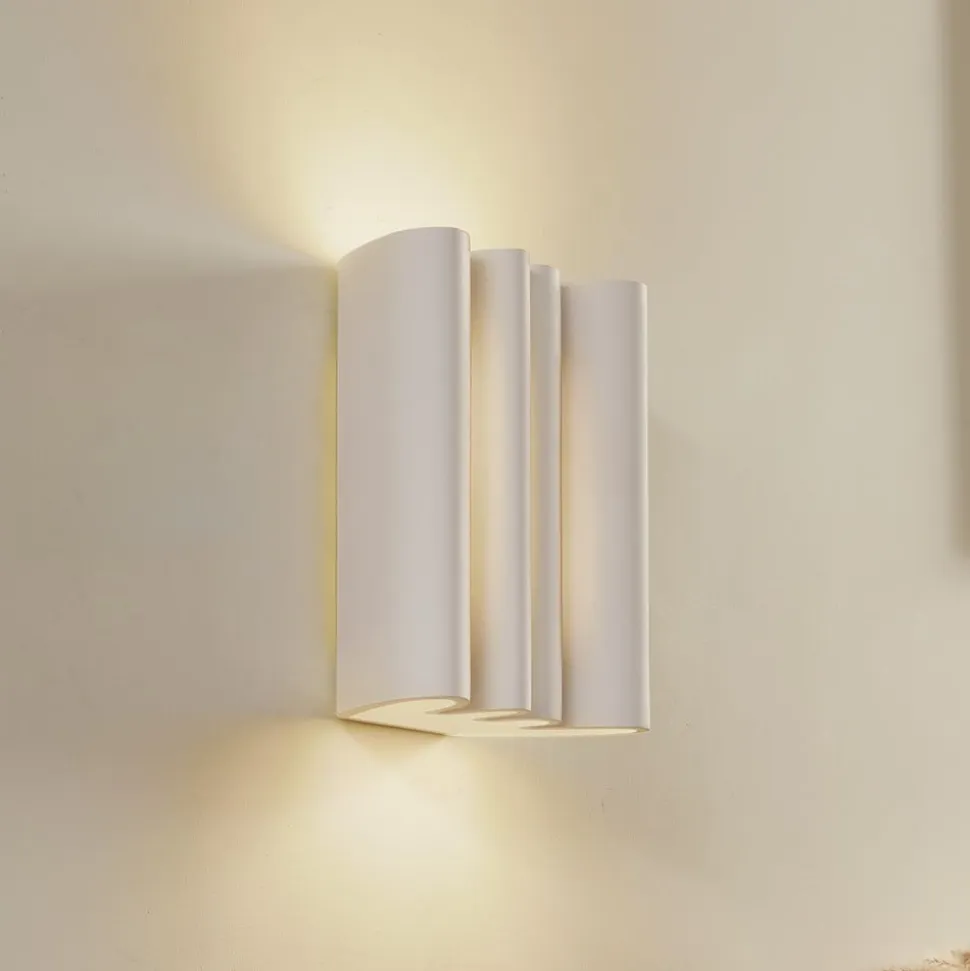 Novali væglampe – elegance og atmosfære til opholdsrum Novali væglampen i hvid, lavet af gips i høj kvalitet, giver et moderne og stilfuldt præg til enhver stue, spisestue, soveværelse eller gang. Dens rene design passer perfekt ind i moderne interiør og skaber en atmosfære, der spænder fra afslappende til energigivende, afhængigt af dine behov. Selvom dette armatur ikke er udstyret med en integreret dæmper, kan det nemt kombineres med en ekstern dæmper for at regulere lysstyrken individuelt og tilpasse lysstemningen perfekt til enhver situation. Oplev, hvordan Novali væglampen kan ændre stemningen i dine rum og skabe en fascinerende lysoplevelse.