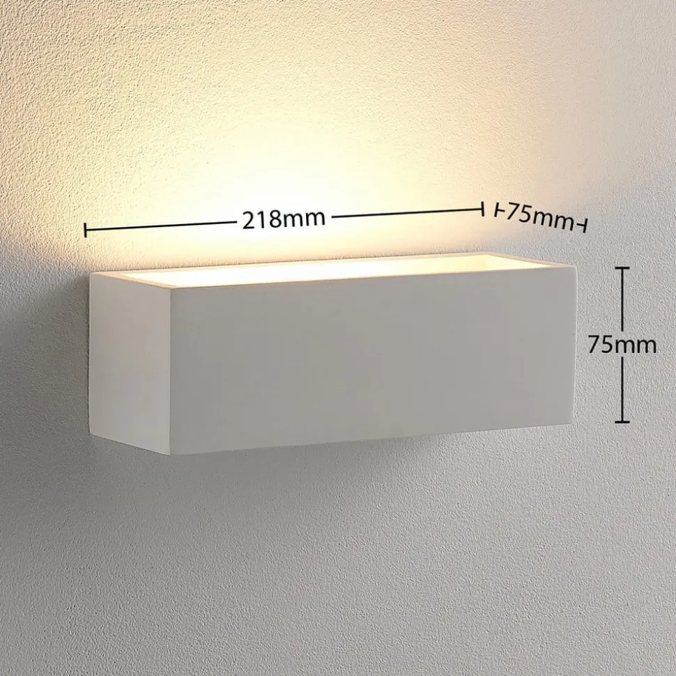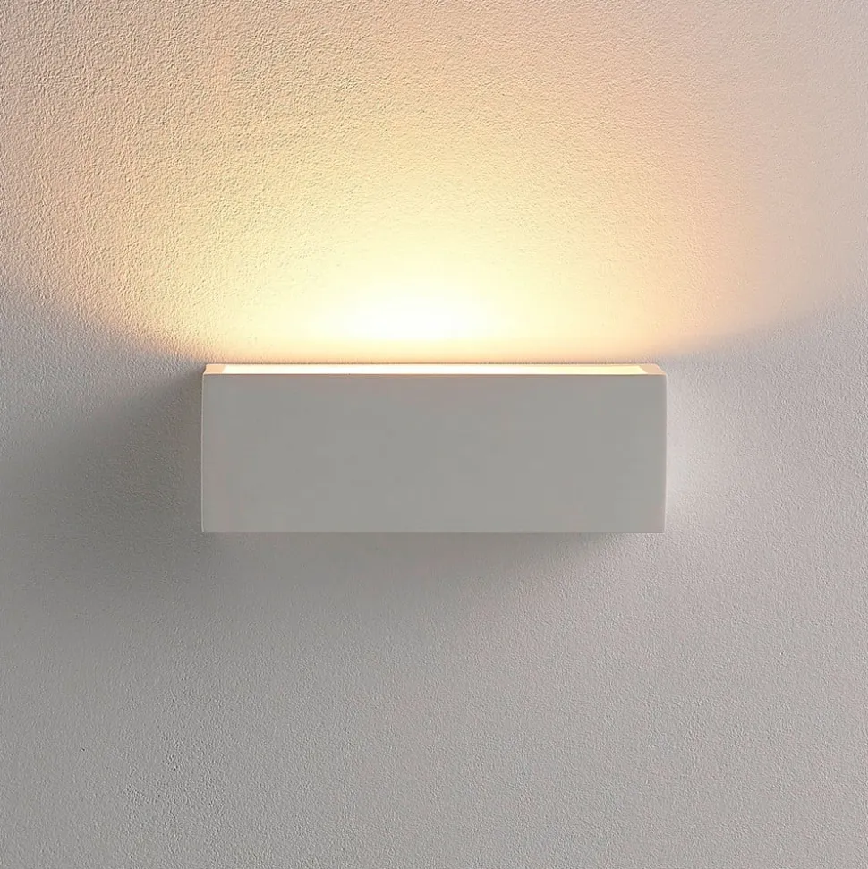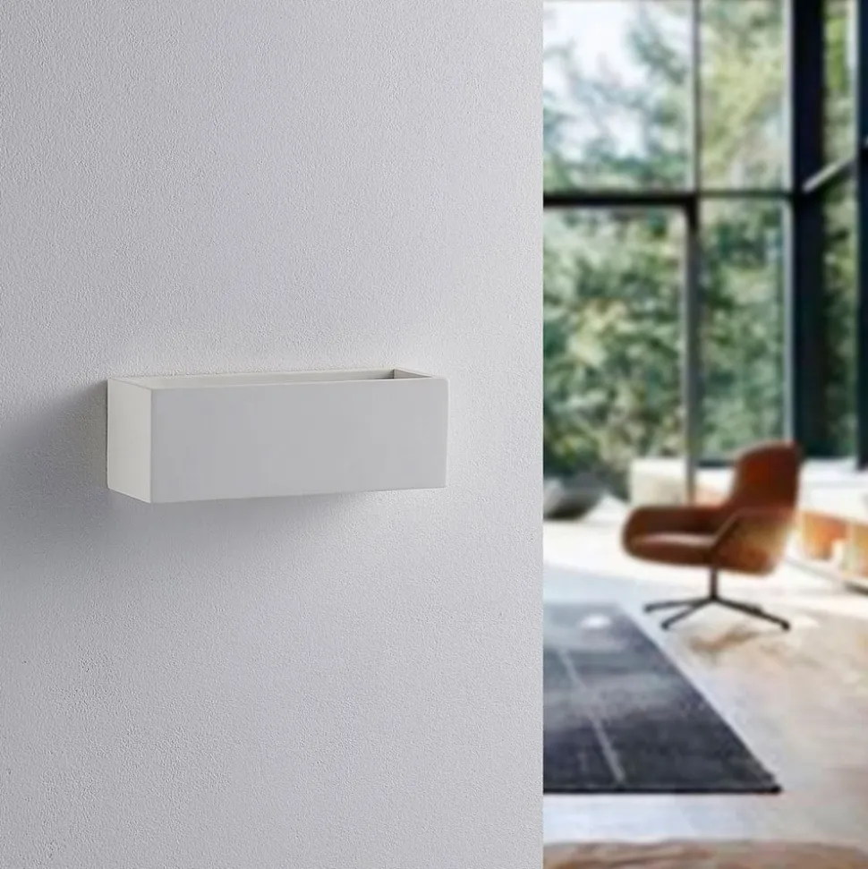 Kantet, hvid gipsvægslampe Santino med et slankt look Santino har et helt tidløst look med sin kantede form og spotlighter et smukt opadgående lys, der virker meget hyggeligt. Gipsvægslampen er derfor ideel til stemningsfuld accentbelysning og vil lyse mange aftener op med en hyggelig effekt. Endelig skal det nævnes, at gipsoverflader er velegnede til at blive malet. Det åbner op for helt nye muligheder for at individualisere armaturet efter egne ideer.