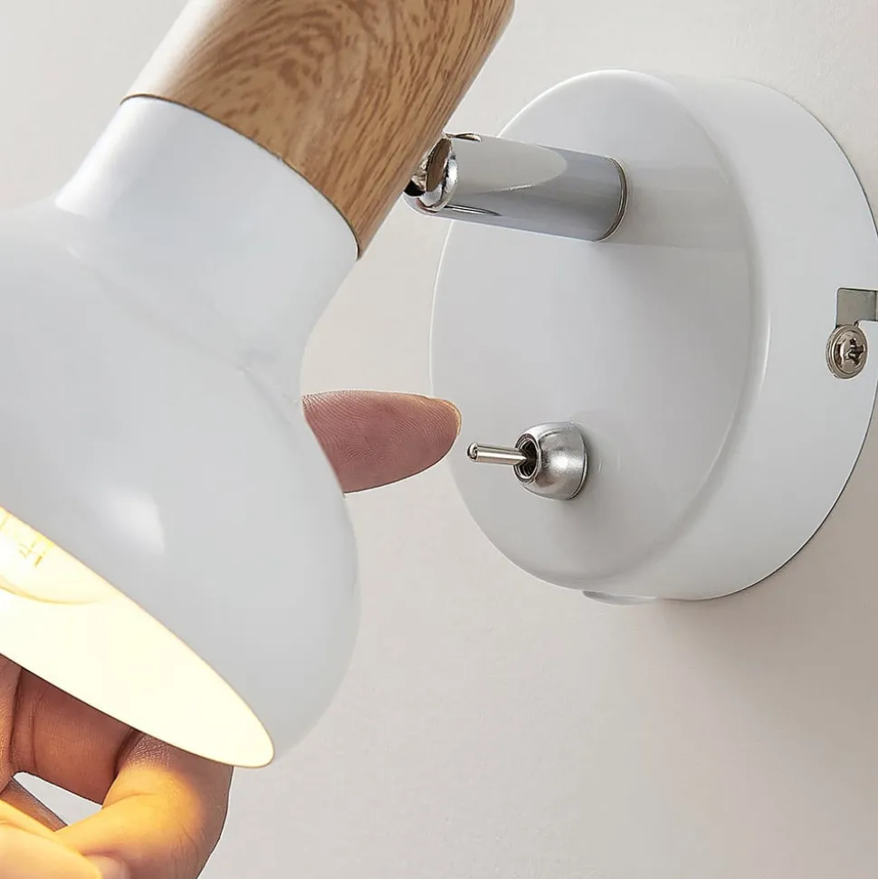 Smuk Fridolin metalspotlight i hvid med træfarvet dekor Denne spotlight har en relativt bred, rund skærm med en attraktiv finish, som er lavet af metal og har en træfarvet finish ved overgangen til rammen, som lyser op i looket på en individuel måde. På den runde ramme på metalspottet, som kan monteres på væggen eller i loftet, er der en vippekontakt til tænding og slukning, som især er relevant ved vægmontering og dermed udgør en merværdi for forbrugeren. Metalskærmen kan flyttes efter behov takket være hængslet.