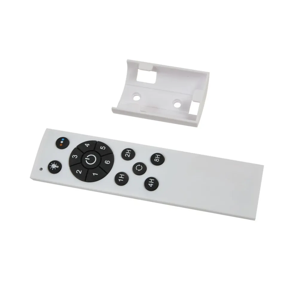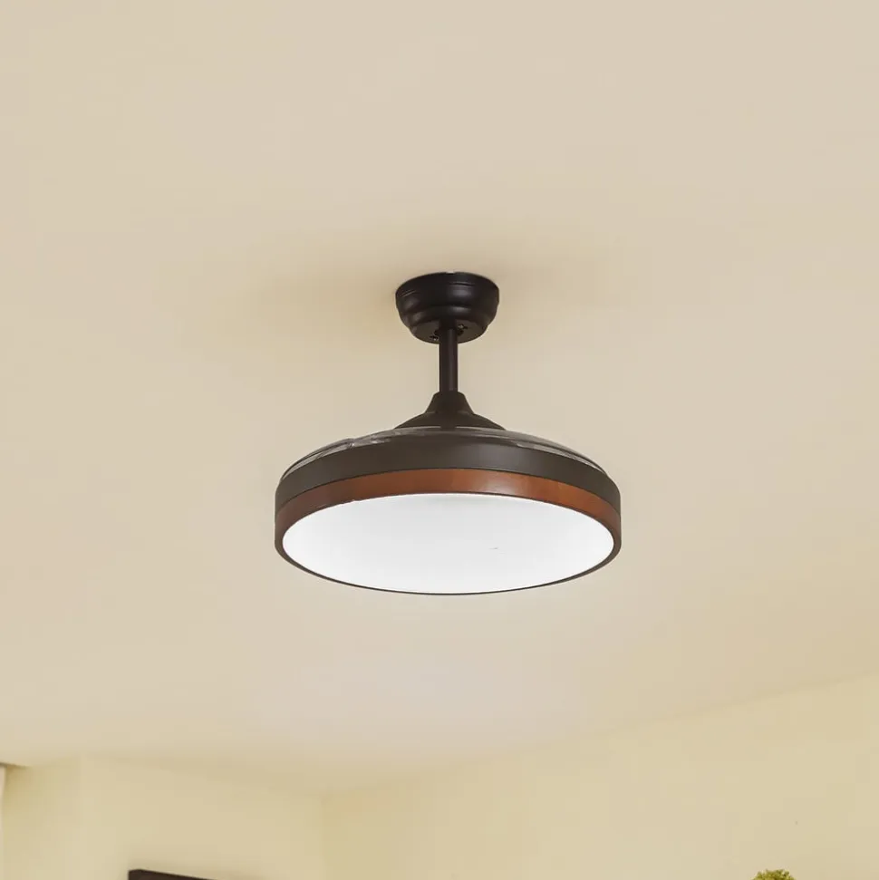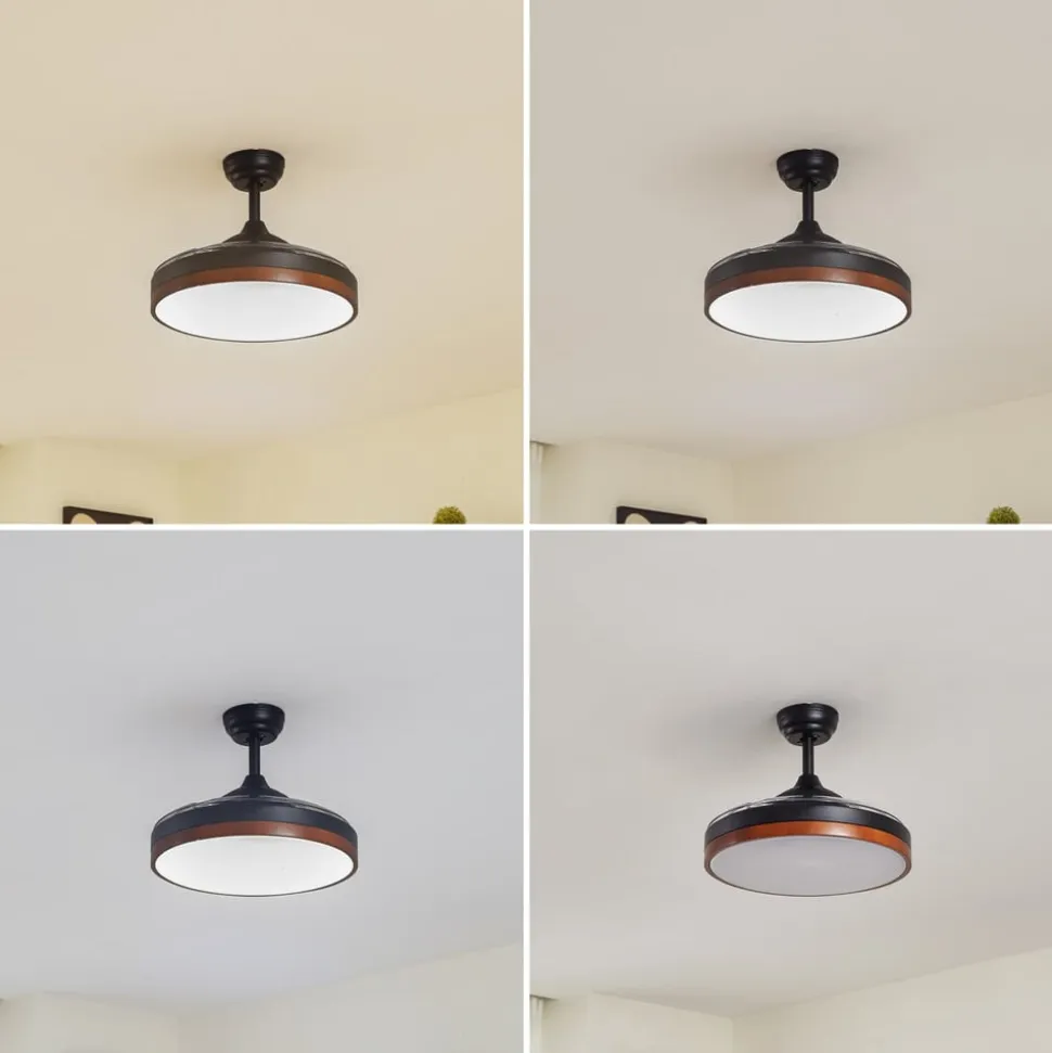 Sort Oras LED-loftventilator med udtrækkelige vinger Når Oras LED-loftventilatoren er slukket, ligner den en simpel lampe. Lyset sendes ud i rummet via den store, runde diffusor og kan indstilles til tre forskellige lysfarver med forskellige lysstrømme ved hjælp af fjernbetjeningen. De gennemsigtige plastvinger er skjult over hovedet og foldes ud, så snart ventilatoren er tændt. Kombinationen af sort, de gennemsigtige vinger og den træfarvede ringdetalje, som indrammer lyskilden hele vejen rundt, giver loftventilatoren et meget moderne look. Den integrerede frem- og tilbageløbsfunktion gør det muligt at bruge den både sommer og vinter. Den medfølgende fjernbetjening kan bruges til at styre lysfarven og de forskellige hastighedsniveauer samt indstille en timer. Den integrerede DC-motor garanterer også støjsvag drift. Tekniske detaljer – Lysfarve justerbar i tre trin (3.000 K / 1.670 lm, 4.000 K / 2.000 lm, 6.500 K / 1. 700 lm) Effekt pr. hastighed: 1.700 lm.700 lm) Effekt pr. hastighed: – 40 watt ved 225 rpm – 22 watt ved 180 rpm – 4,9 watt ved 140 rpm – Optimal rumstørrelse: 9-10m² – Maksimal volumenstrøm: 96,96 m³/min – Maksimal lufthastighed: 2,946 m/sek – Ventilatorens lydeffektniveau: 47 dB (A) – Serviceværdi (SV): 3,81 (m³/min)/W – Fjernbetjeningen kræver 2 x AAA NiCa-batterier