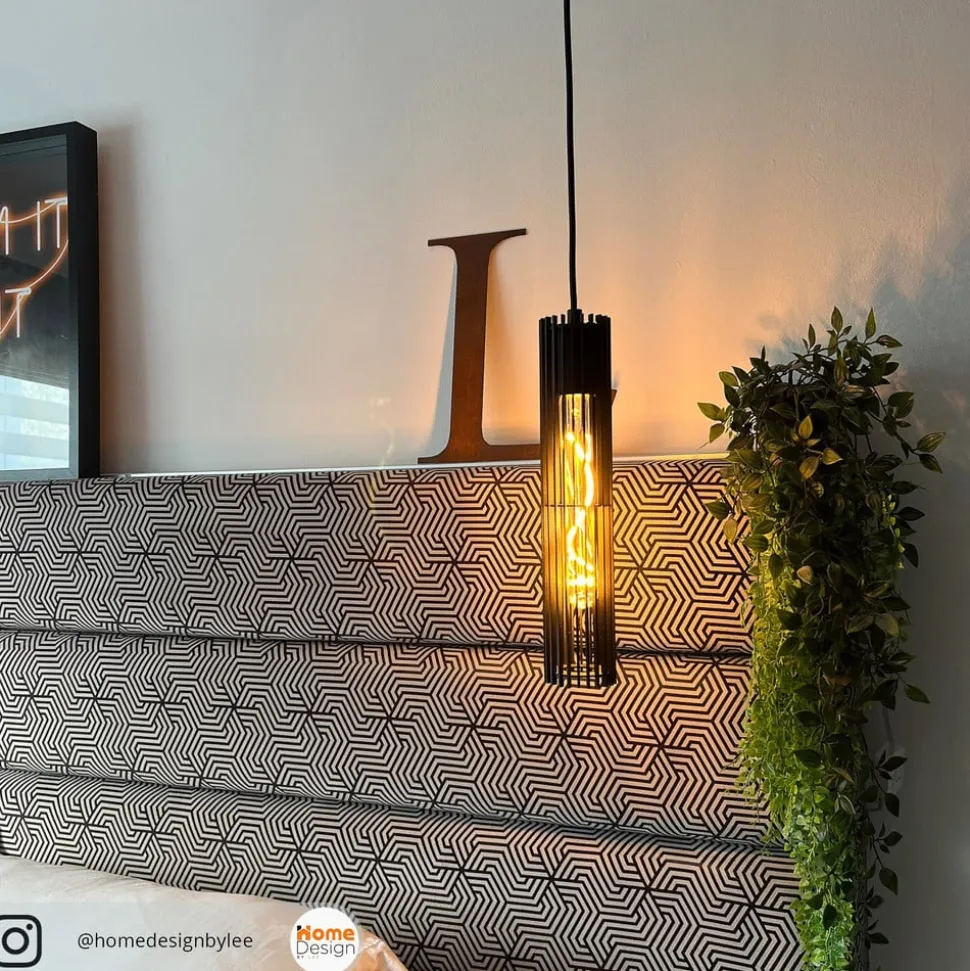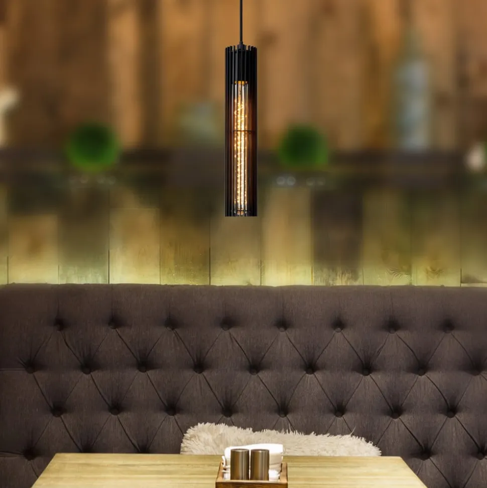 Lionel pendel i sort med åben skærm Lionel-pendlens udseende kan påvirkes af valget af lyskilde. Den lange skærm, som har et åbent design bestående af enkelte fine metalstivere, indeholder en E27-fatning, der skal monteres med en rørformet LED-pære (medfølger ikke). Afhængigt af valget af lyskilde kan man påvirke lysudstrålingen og armaturets udseende. Som vist ser en lampe med roterede LED’er arrangeret i filamentteknologi smukkest ud.