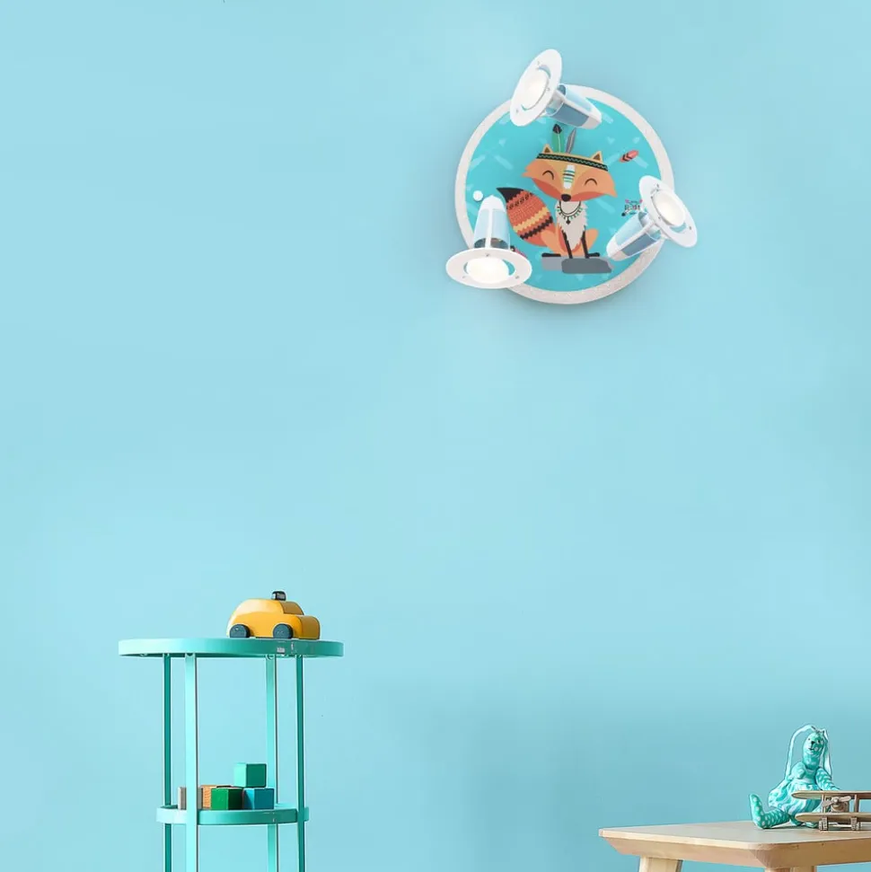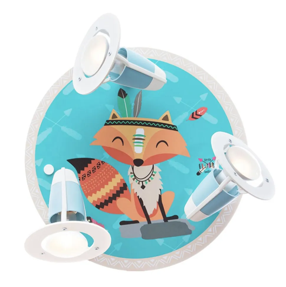 Little Indianers loftlampe er en rund trælampe med tre bevægelige lyskilder. Det børnevenlige motiv viser ræven Filip i indisk stil, der er prydet med et fjerhovedbeklædning.