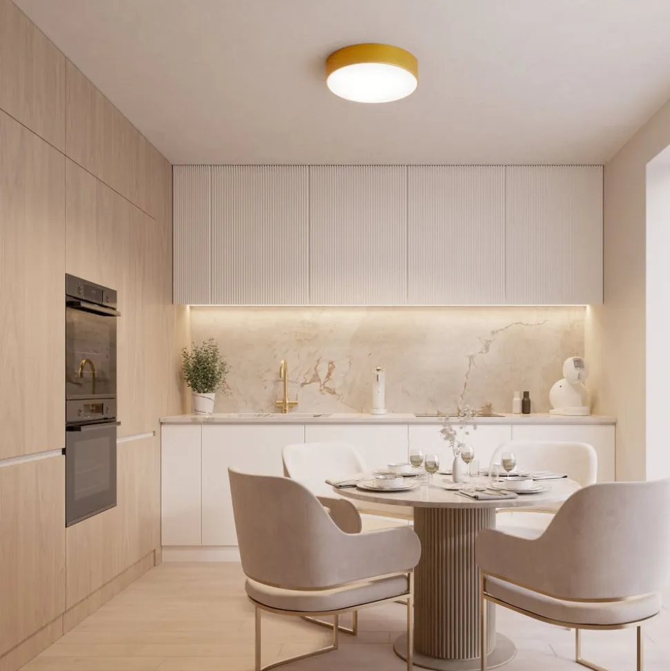 Oplev, hvordan loftlampen Cleo 200 forvandler ethvert rum til en oase af stemninger. Udstyret med en E27-pære (ikke inkluderet) tænder loftlampen med integreret bevægelsessensor automatisk, så snart den forudindstillede lysstyrke nås, og der registreres bevægelse. Den gyldne overflade reflekterer lyset på en måde, der bringer både elegance og varme ind i entreen, badeværelset samt på altanen og terrassen.