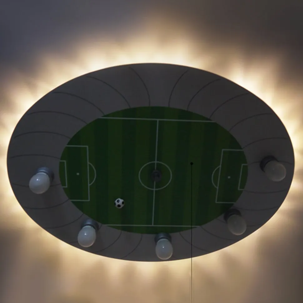Loftslampen Fodboldstadion er et absolut must for alle fodboldfans. Lampen er ovalt formet. I midten af lampen befinder der sig en indtegnet fodboldbane, hvor man endda kan finde en bold. Den ydre, hvide kant danner en tribune. Den har fem lyskilder med E14-fatninger, hvilket gør lampen ideel til generel belysning. Dog egner loftslampen Fodboldstadion sig også utroligt godt til ren dekorationsbelysning. Hovedbelysningen kan tændes eller slukkes ved hjælp af trækafbryderen. LED-lyspunkterne betjenes med kontakten i rummet. Hvis hovedbelysningen er tændt, tændes eller slukkes denne ved hjælp af kontakten i rummet. LED’erne er monteret bag lampen og skaber en indirekte belysning. Lampen sørger for sjov og dejligt lys til ethvert børneværelse.