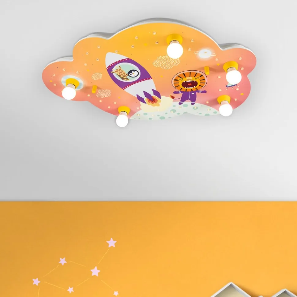 Med tændbar LED-nattehimmel – Escape loftslampe til børneværelset Escape-loftslampen består af et træpanel, der er formet som en stor sky og har en flot, børnevenlig illustration. Ud over de i alt fem lamper, som giver tilstrækkelig rumbelysning, er der her installeret små LED’er, som kan tændes som en nattehimmel ved hjælp af den almindelige vægkontakt og den integrerede firetrinskontakt eller kan lyse separat. Det er praktisk, at alt er integreret i lyset og kan styres via en almindelig kontakt ved at klikke flere gange på væggen.
