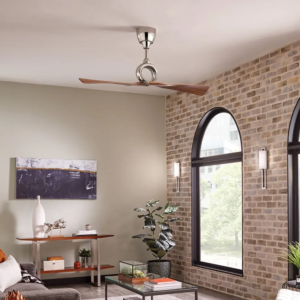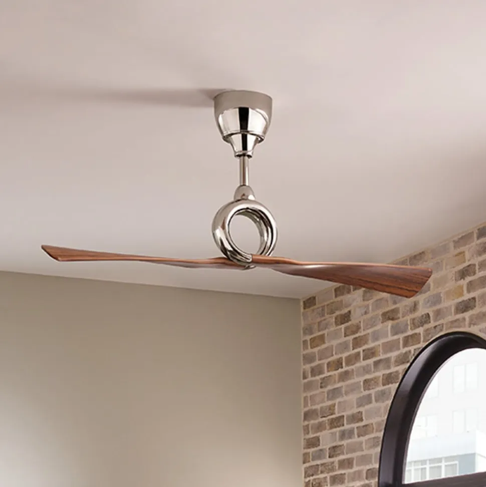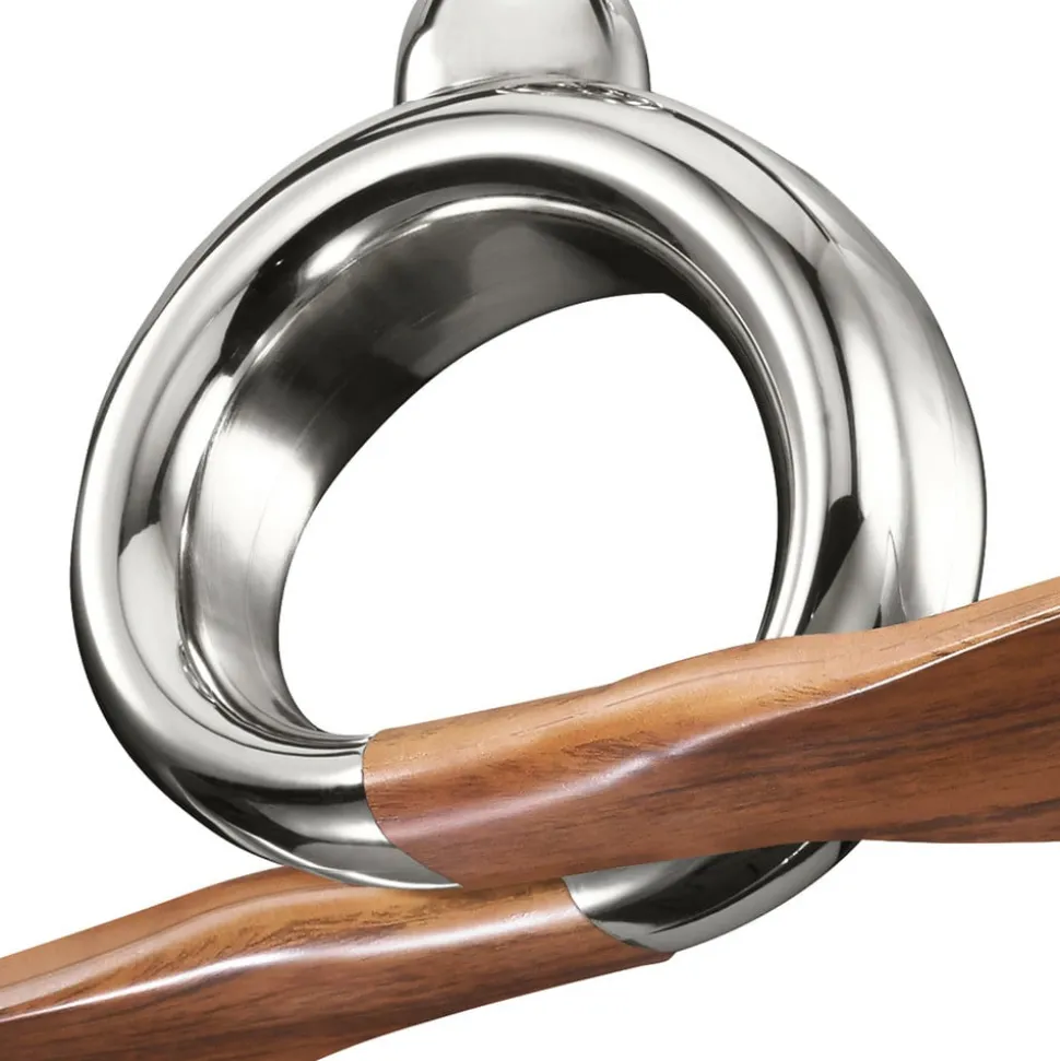 Den tofløjede loftventilator Link virker med sine to vinger af ABS-plast, der udgår fra en stålring, som om den er støbt i ét stykke. Den optiske kontrast mellem poleret nikkel og mørk valnøddetone er også særligt dekorativ. Der medfølger en fjernbetjening.