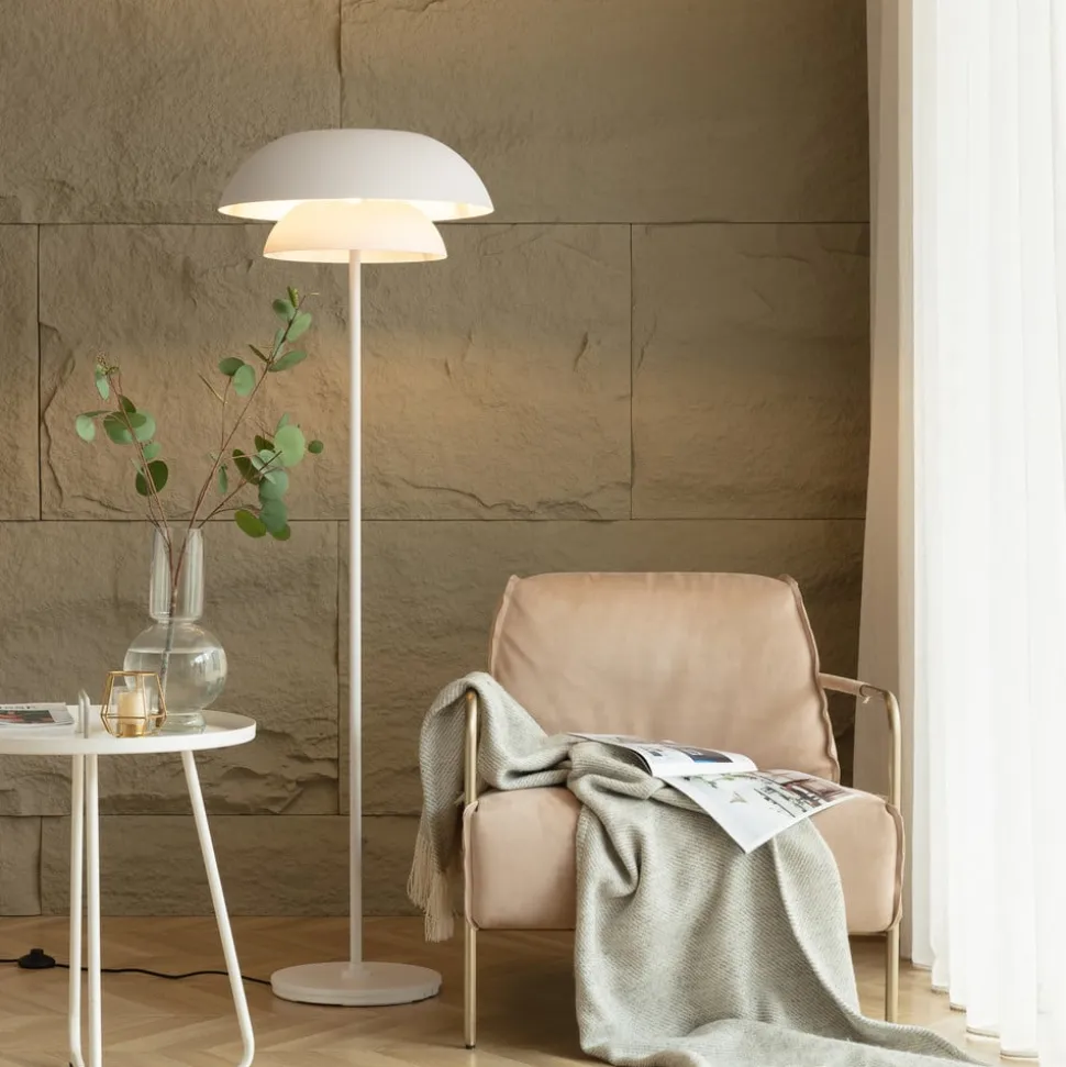 Elegant Kellina gulvlampe i en enkel hvid farve Kellina gulvlampen har en diskret overfladefinish og en ekspansiv dobbeltskærm, der straks fanger øjet. Den ligner et rigtigt designermøbel og kan bruges både i hjemmet og i hotel- og restaurationsbranchen. Jernstellet og den runde base giver en stabil støtte, mens den let nedadbøjede lampeskærm fungerer som et elegant blikfang og gør denne lampe til et særligt tilbehør til hjemmet. Brugeren kan montere lampen med en hvilken som helst egnet pære, hvorved lyset hovedsageligt udsendes nedad for at minimere risikoen for blænding.