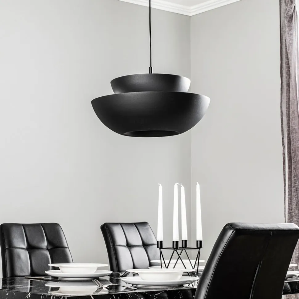 Slående hængelampe Kellina med en stilfuld dobbeltskærm Kellina er en elegant hængelampe, der imponerer med sin stålskærm. Designet ser elegant og moderne ud og passer til forskellige indretningsstile og rum. Lampen kan skabe en hyggelig atmosfære over dit eget spisebord eller over en bardisk på et hotel – Kellina kan bruges på mange forskellige måder. Mens ophænget er holdt helt enkelt, skiller armaturet sig først og fremmest ud med sin velformede dobbeltskærm. Skærmen giver en blændfri lysfordeling i rummet og er et ægte blikfang i loftet.