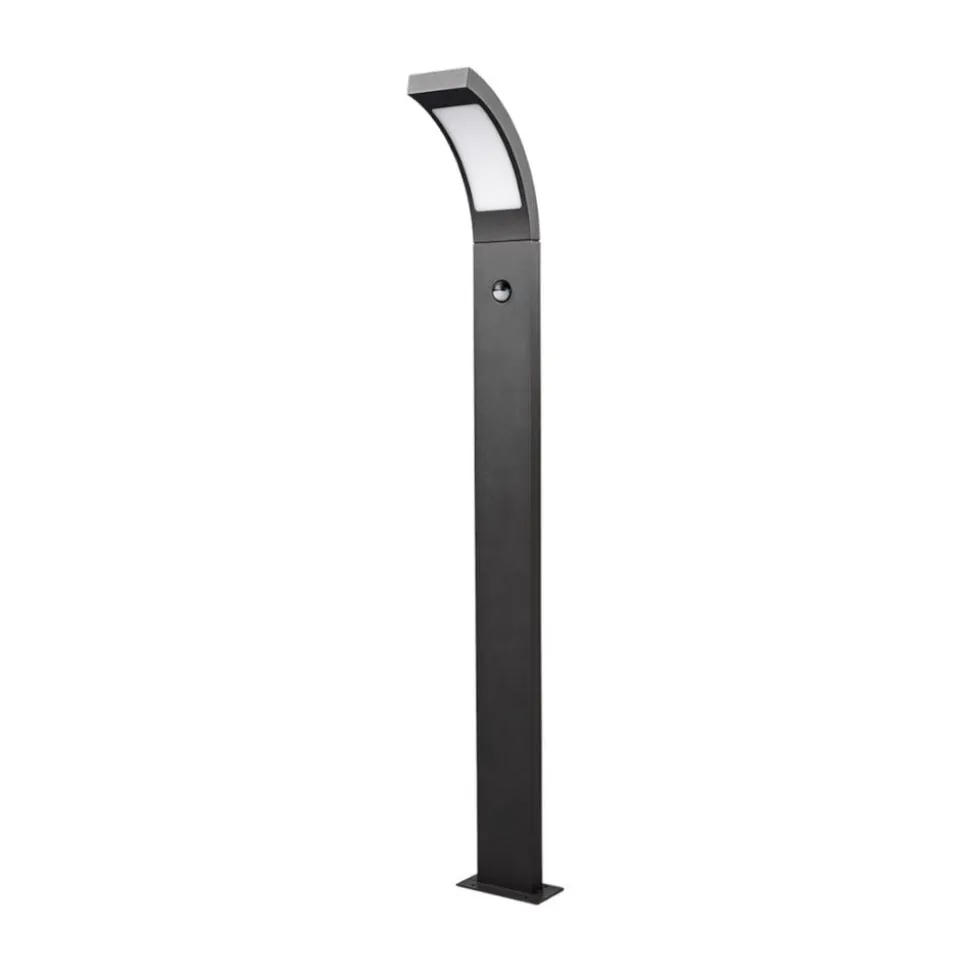 Grafitgrå Juvia LED pullert med indbygget sensor Takket være LED’erne giver Juvia stærkt lys uden at bruge meget energi. Det gør det muligt at belyse stier og indkørsler på udendørsarealer på en energieffektiv måde. Lyset er endnu mere optimeret til kravene takket være en integreret bevægelsessensor, som er placeret lidt under det oplyste område og det buede hoved. Den har en registreringsvinkel på 120° og en maksimal rækkevidde på 6-9 meter. Det, der kan justeres, er lysets varighed, som kan variere fra 5 sekunder til 8 minutter.
