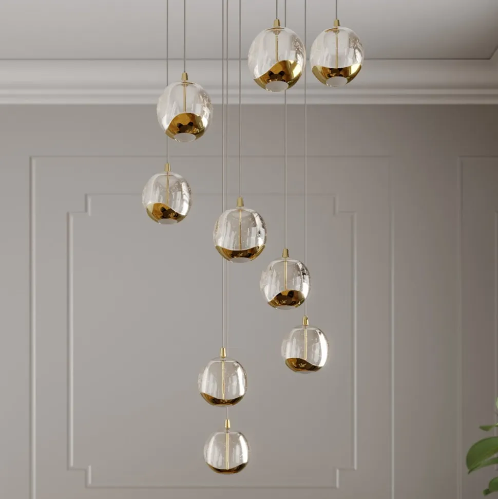 Hayley LED-hængelampe med ni udsøgte glaskugler i elegant guldfinish Den særlige Hayley LED-hængelampe er kendetegnet ved sit sofistikerede design og moderne LED-teknologi. Både den runde baldakin og de filigrane metalelementer, der omgiver undersiden af glaskuglerne, har fået en gylden finish. Indersiden af de ni kugler overrasker med dekorativt indbyggede luftbobler, der understreger armaturets individuelle flair. De permanent installerede, kraftige LED’er udsender et behageligt, varmhvidt lys, som også er velegnet til at oplyse større rum. Lyset fordeles indirekte og jævnt i rummet uden at blænde. Det elegante og markante design af denne smukke lyskilde kan integreres i en række forskellige interiører og efterlader et varigt indtryk på beskueren.