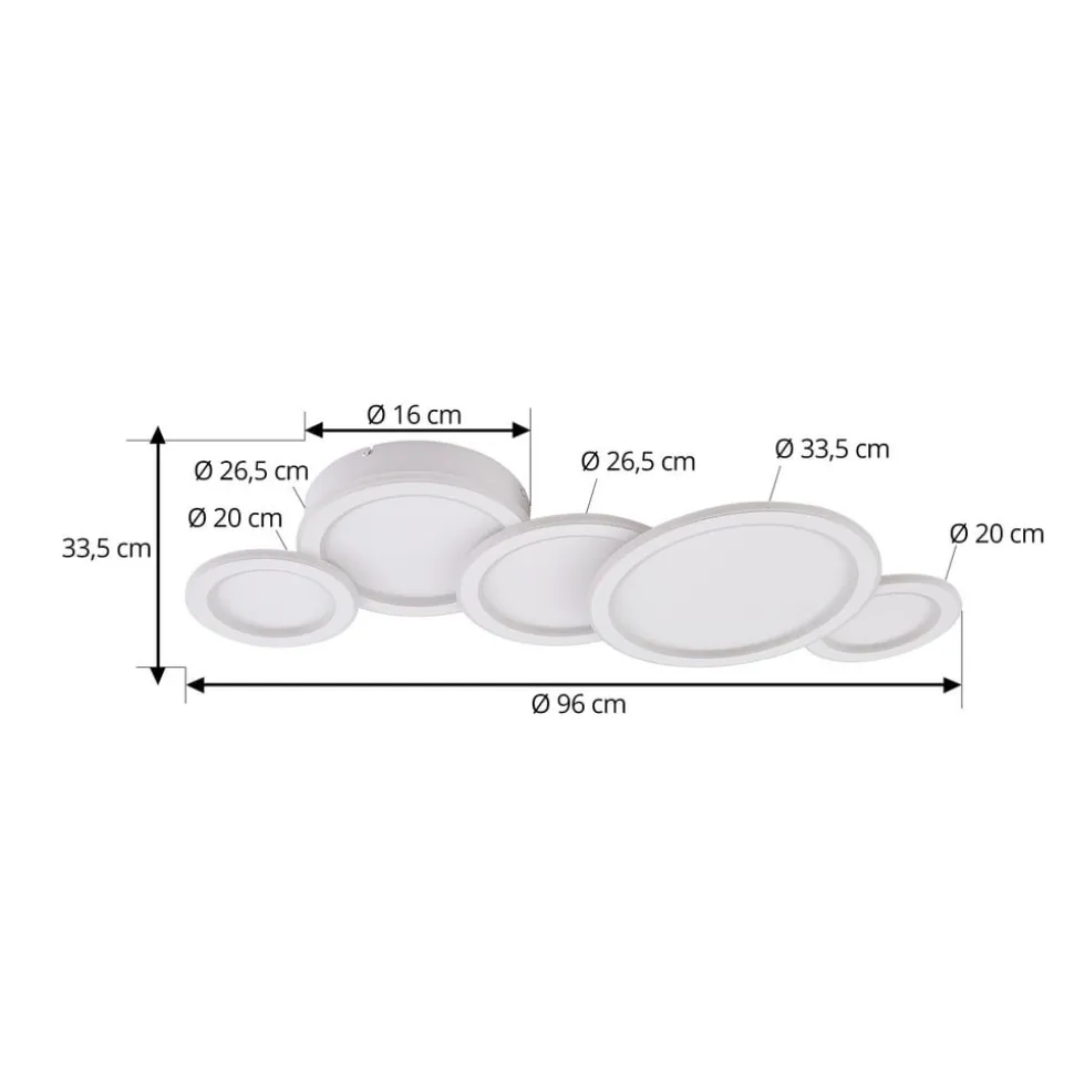 - Lyscirkel 1 – Ø 33,5 cm, højde 1 cm; Lyscirkel 2 – Ø 26,5 cm, højde 1 cm; Lyscirkel 3 – Ø 20 cm, højde 1 cm; Baldakin – Ø 25 cm, højde 4,5 cm