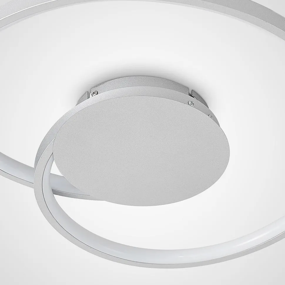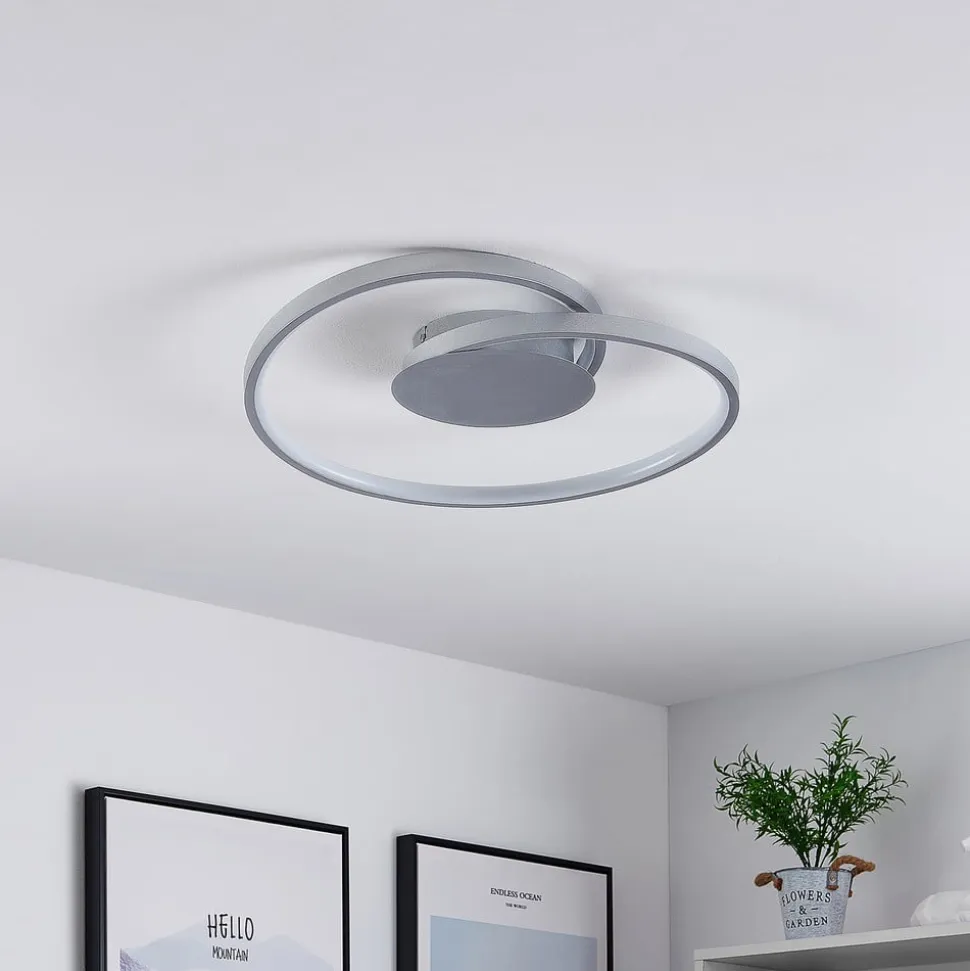 Enesa rund LED-loftlampe af aluminium og jern i sølv LED-loftlampen Enesa har en stilfuld og praktisk karakter. En smal stiver rejser sig svungent fra et rundt loftbeslag og bevæger sig en gang i en cirkel for at skabe et attraktivt mønster. Faste LED’er løber langs disse stivere, og deres lysstyrke kan dæmpes ved hjælp af vægkontakten. Ved hjælp af 4-trins dæmpningsteknologien og den almindelige slukfunktion kan armaturet dæmmes til 100 %, 60 %, 30 % og 13 % af sin normale lysstyrke og tændes og slukkes som normalt. Dette gøres ved at trykke på vægkontakten flere gange. Det moderne design af Enesa LED-loftlampen sætter stilfulde accenter på flade lofter og ser især godt ud i en stue eller et soveværelse.