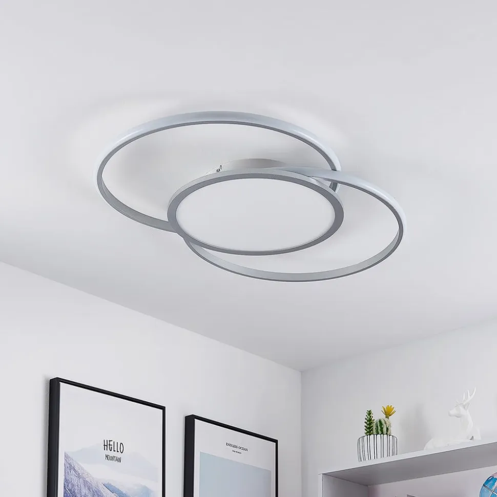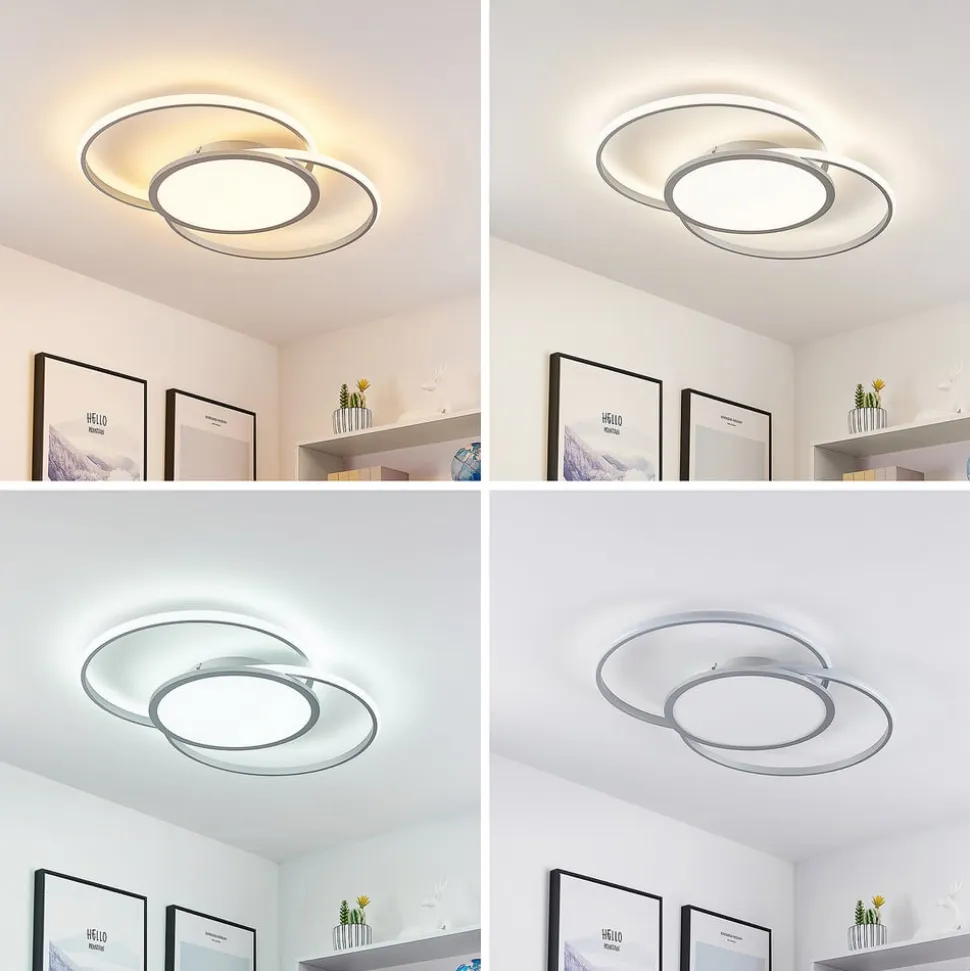 Stilfuld Senne LED-loftlampe i sølv med praktiske funktioner LED-loftlampen Senne kommer i et moderne design og med praktiske funktioner, der gør livet lettere. Lampekroppen er lavet af aluminium og jern og har et interessant mønster, der består af et rundt element og to ringe, der omgiver det. De fastmonterede LED’er kan dæmpes trinløst med hensyn til lysstyrke (10% – 100%) ved hjælp af en vægkontakt eller fjernbetjening, og lysfarven kan også styres lige så nemt (2.700 K, 4.000 K og 6.500 K). Disse funktioner giver LED-loftlampen Senne en vis grad af fleksibilitet og gør den til den perfekte ledsager, når det gælder belysning af en stue. Det stilfulde, moderne ydre kan ubesværet integreres i indretningen uden at overskygge resten af møblerne.