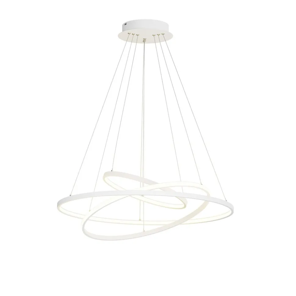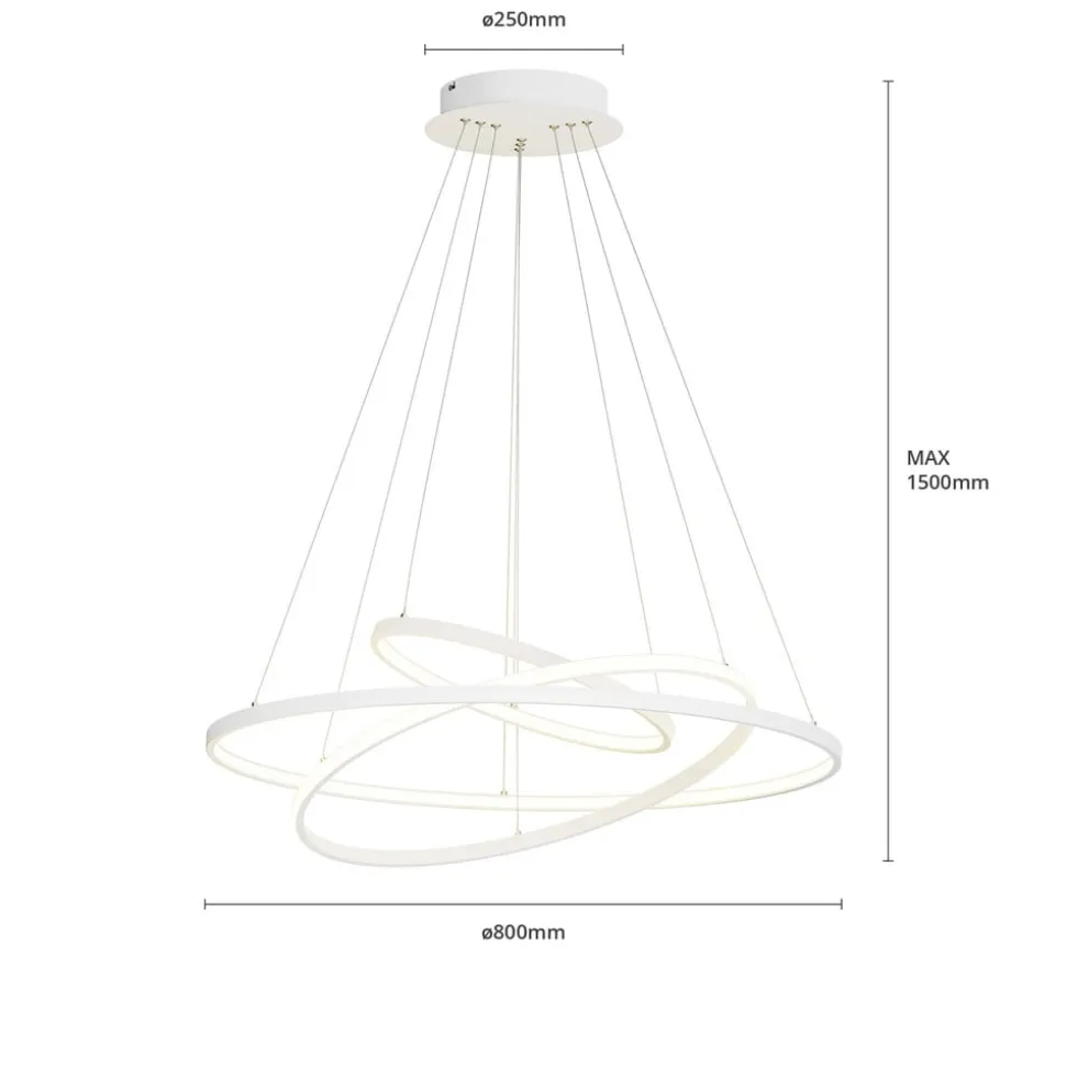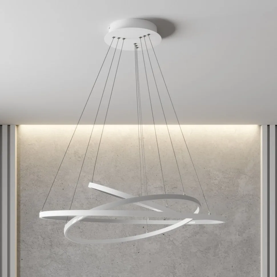 Pendellampens ophængningsanordning er helt hvid og kombinerer metal- og plastelementer til et harmonisk helhedsindtryk. Dermed kan lampen integreres elegant i moderne indretningsstilarter. På pendelstængerne er der fastgjort tre lysringe, der passer sammen som planetringe. Disse skaber en diskret lys- og skyggeeffekt, der nemt kan dæmpes i tre trin med SwitchDim-funktionen via vægafbryderen.