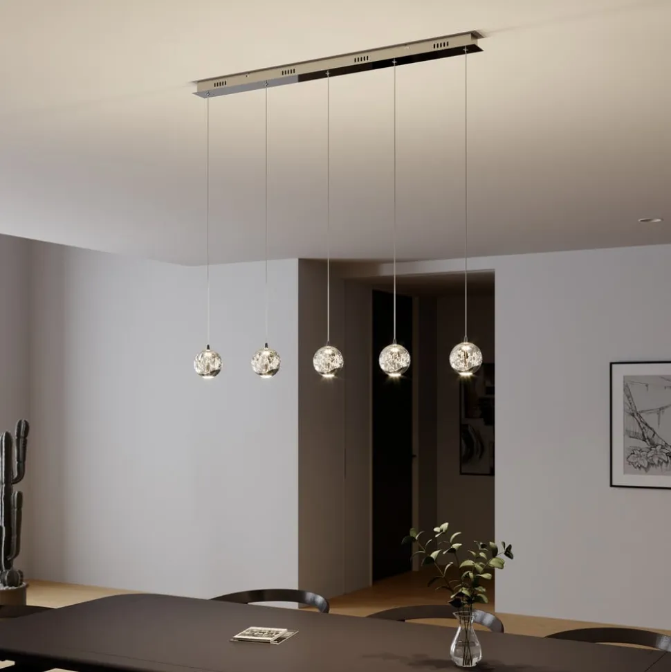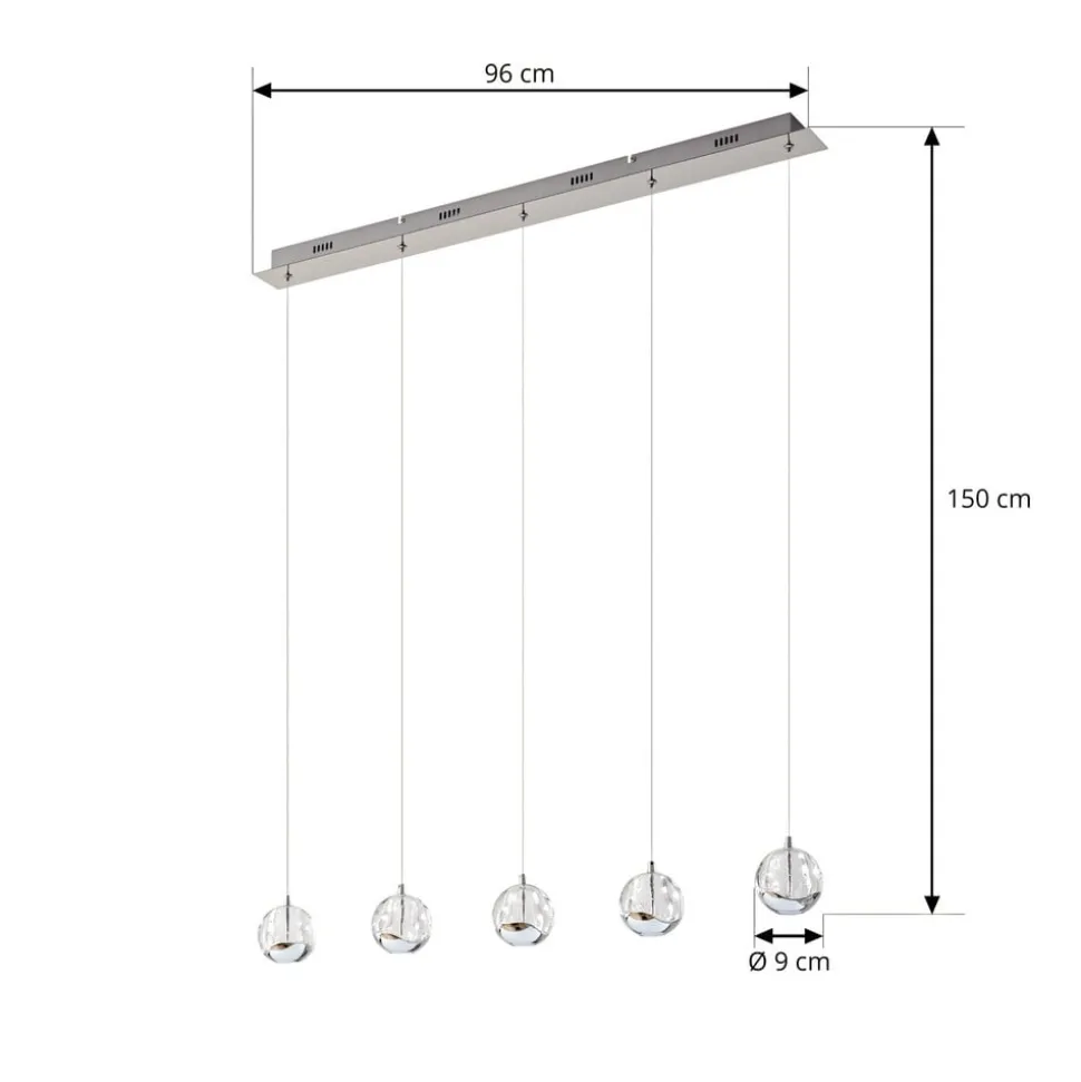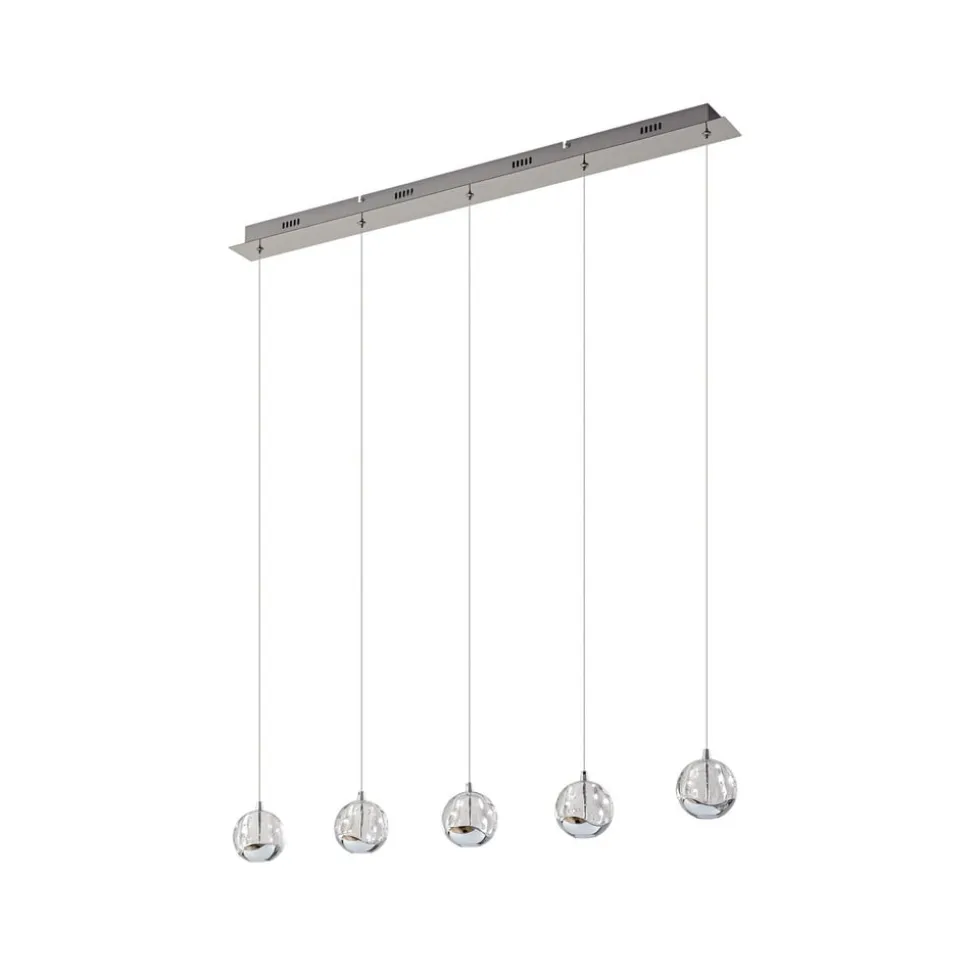 Funklende Hayley LED-pendellampe til spisestuen, glaskugler forfinet med forkromede detaljer Hayley er en attraktiv LED-pendellampe med fem skærme af bobleglas, der er ideel til montering over et spisebord. Den aflange form og de fem skærme sikrer, at bordoverfladen bliver oplyst over et stort område. Lyset kan udsendes både opad og nedad. For at sikre, at det nedadrettede lys ikke blænder eller har en ubehagelig effekt, er der en hvid glasafdækning på dette punkt. Skærmene er også udstyret med dekorative kromlister, og lysbilledet funkler smukt og skaber en særlig glamourøs effekt.