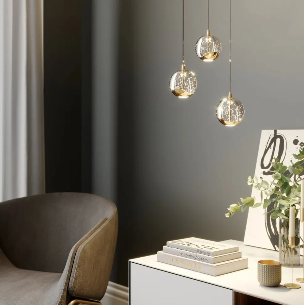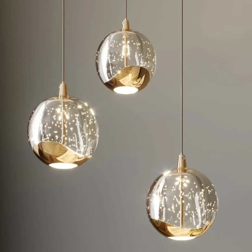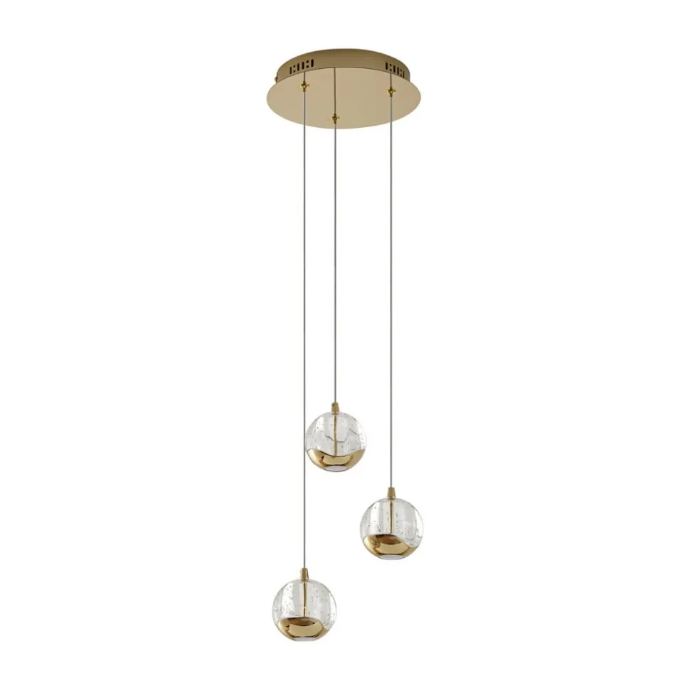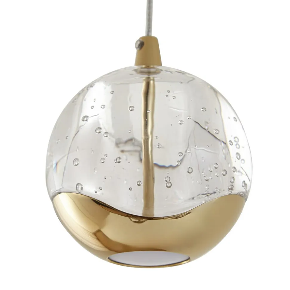 Hayley LED-hængelampe med tre glaskugler og metalelementer i skinnende guld Den 3 lyskilder version af Hayley passer godt over et spisebord og imponerer med en særlig glamourfaktor, som udgøres af det spotlight funklende bobleglas og metalelementerne i guld. Skærmene har et kompakt design og er alle kugleformede. Den største del er lavet af det attraktive bobleglas, men i bunden er der et metalelement i en skinnende guldtone, mens den direkte lysemission i bunden er blødere og mere jævn takket være et element lavet af hvidt glas, der næsten ikke skaber nogen blænding. Et ægte HighLight med iøjnefaldende kvaliteter!