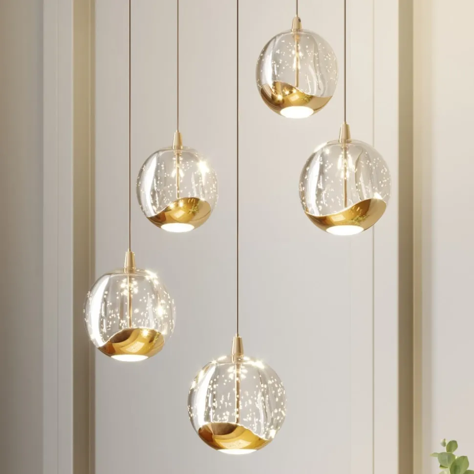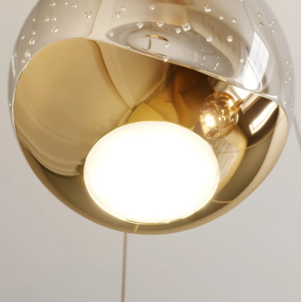 Guldfarvet LED-pendellampe Hayley med fem glaskugler med attraktive bobler Hayley er en pendellampe med stil og ynde, der ikke vil se malplaceret ud i klassisk interiør takket være de guldfarvede metalelementer. De fem skærme er lavet af klart glas med boblestruktur og er på undersiden afsluttet med den guldfarvede metaldekor. De udsender LED-lyset både direkte og indirekte, selv om der er et hvidt glaselement på undersiden, som får lyset til at virke blødere og mere hyggeligt. Samlet set kan man sige, at Hayley skaber en funklende lysoplevelse med specialeffekter og et imponerende spotlight. LED-teknologien sikrer et lavt strømforbrug med god effektivitet, hvilket skaber et klart lys. Pendellampen er den ideelle tilføjelse til belysningen i spiseområdet.