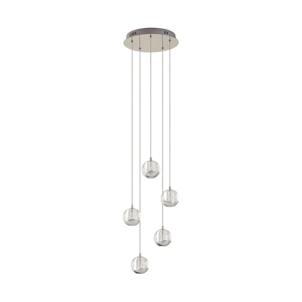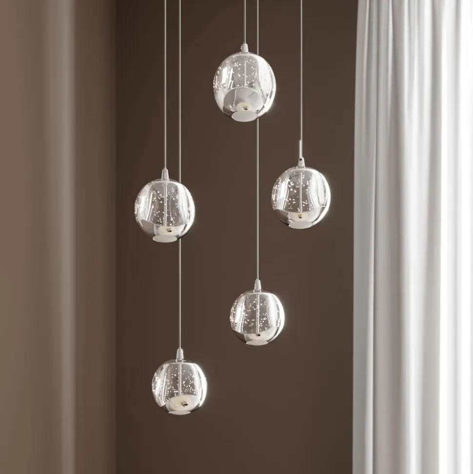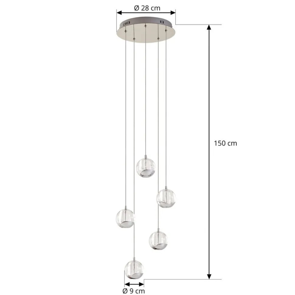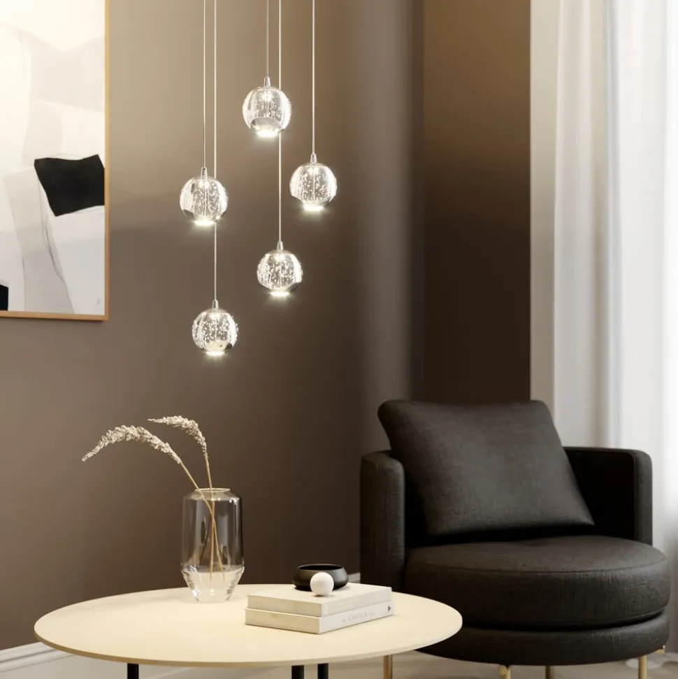 5 lyskilder LED-pendellampe med perfekt formede glaskugler og forkromede detaljer Glasset i de fem kugler er ikke bare klart, men har dekorative luftbobler i sin struktur, der ikke bare ser ekstravagante ud, men også bidrager til en glamourøs lyseffekt. Der er også et dekorativt element af skinnende krom på undersiden af glaskuglerne, som stilfuldt afrunder det samlede design. Lyset udsendes direkte og indirekte og er blødt og ensartet på undersiden takket være et hvidt glaselement, der forhindrer blænding. LED-pendellampens design med de effektive LED’er gør den ideel til bordbelysning i opholdsrummet.