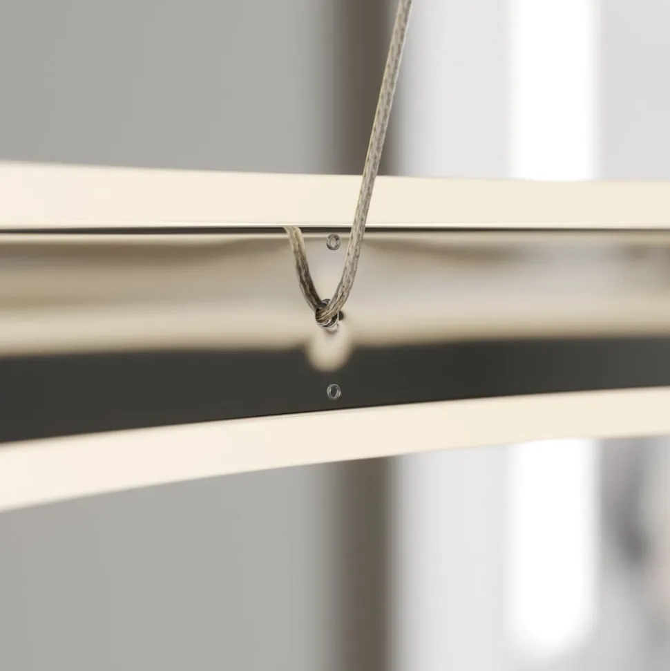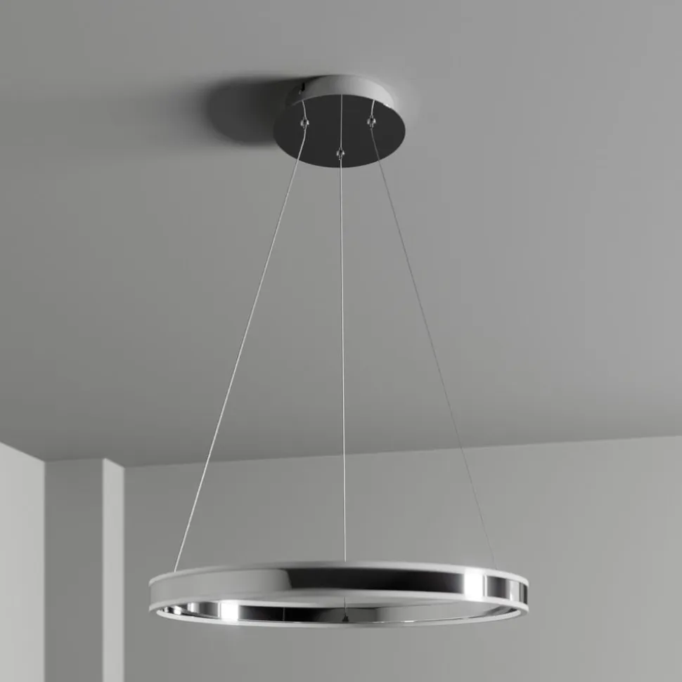 Lyani – tretrins dæmpbar pendel med integreret LED-teknologi ved hjælp af vægkontakten Denne LED-pendellampe består af en stor, lysende ring, hvilket gør den ideel til at installere over et bord i køkkenet eller spisestuen. Ringen har en skinnende kromfinish og hænger ned fra loftet i fine stålkabler. Da der ofte er brug for forskellige niveauer af lysstyrke over et spisebord afhængigt af situationen, kan pendellampen dæmmes i tre trin ved hjælp af en vægkontakt for at skabe både stærkt og mere hyggeligt lys med mindre lysstyrke.
