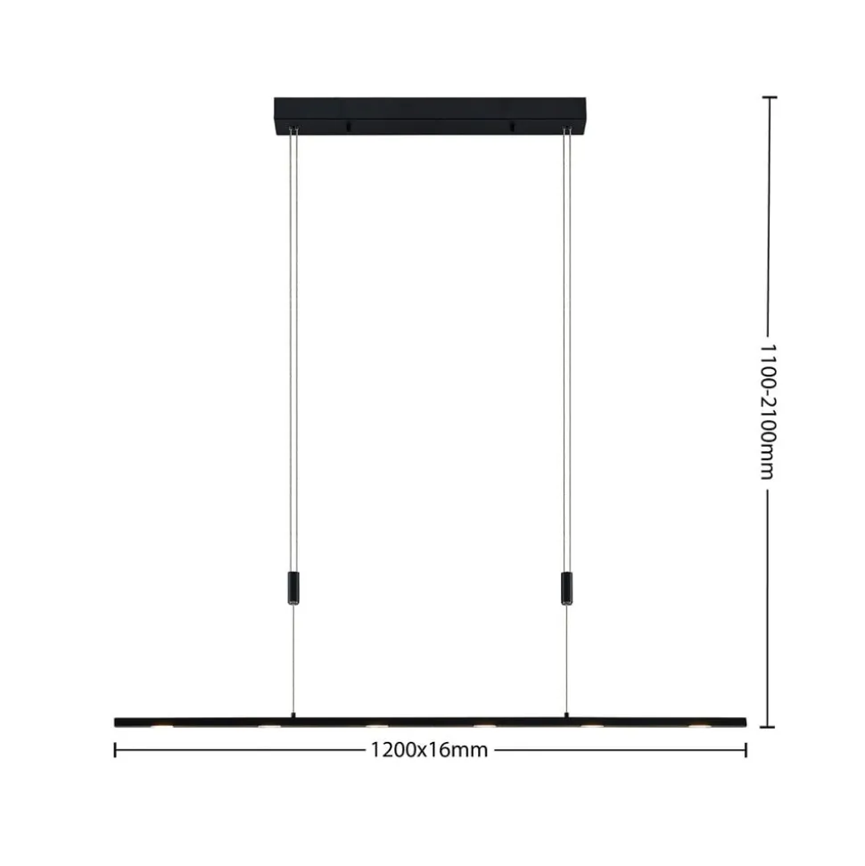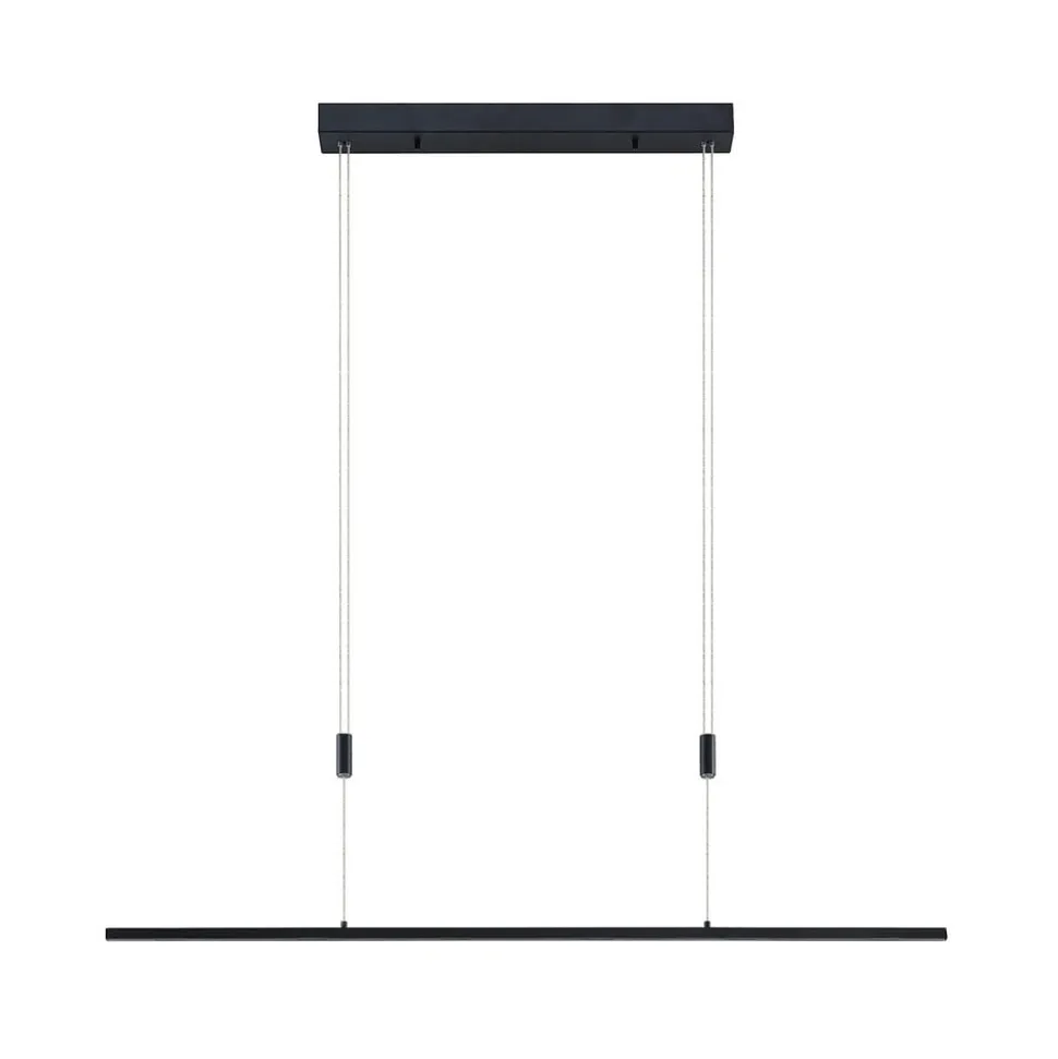 Højdejusterbar Stakato LED-pendel i mat sort, 6 lyskilder Skærmen på Stakato LED-hængelampen er lang og smal og lavet af aluminium, hvor seks LED-moduler er jævnt fordelt bag akrylafdækninger. De spotlighter et varmhvidt lys nedad, hvilket gør hængelampen til den ideelle lyskilde over spisebordet eller en køkkenø i moderne indrettede rum. Lampen imponerer med sin høje grad af funktionalitet. Ikke alene kan ophængningen af det lange lyselement varieres i området fra 110 til 210 cm med få enkle trin, lysintensiteten kan også skiftes til tre forskellige lysstyrker uden at skulle installere en dæmper ved hjælp af den eksisterende lyskontakt. En vægkontakt kan bruges til at tænde og slukke lyset som normalt. Takket være 3-trins dæmpningsteknologien med integreret slukkefunktion kan den også skiftes til tre forskellige lysstyrkeniveauer (100 %, 50 % og 10 %) ved at trykke på kontakten flere gange.