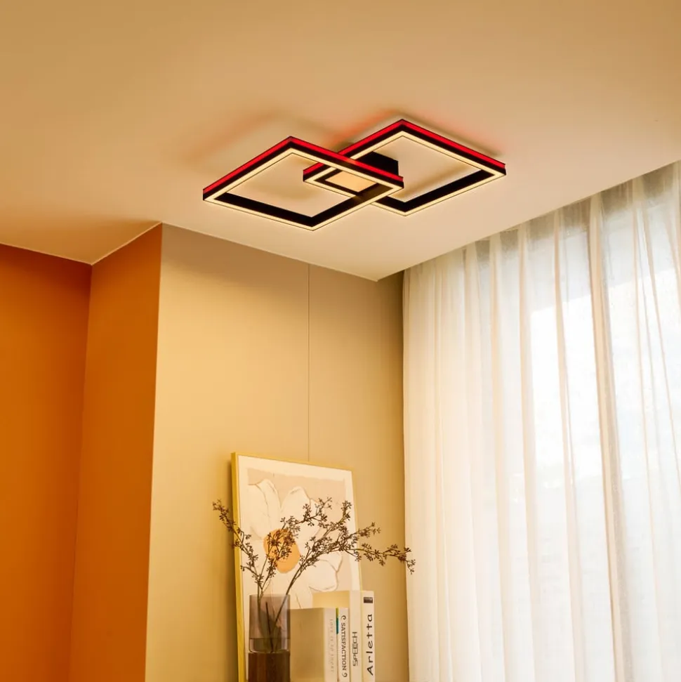 Firkantet LED-loftslampe Tjado – en praktisk ledsager til dine egne fire vægge med dæmpning og CCT-funktion Denne loftslampe vil også få dit hjem til at stråle i ny pragt. Farven på lyset fra loftslampen kan ændres, så det passer til dit humør. Loftslampen kan nemt tændes og slukkes ved hjælp af en fjernbetjening. Den har et attraktivt design og passer smukt ind i din indretning. Dæmpningsfunktionen giver dig mulighed for at justere lysstyrken ved hjælp af en fjernbetjening. Den sorte loftslampe kombinerer alle de kvaliteter og højdepunkter, der kendetegner Lucande-mærket. Den integreres perfekt i ethvert rum og skaber en fantastisk, hyggelig atmosfære. Det behagelige lys fra armaturet får ethvert rum til at se fantastisk ud. En hyggelig atmosfære er garanteret med denne loftslampe – der også kan dæmpes ved hjælp af den gratis Tuya-app (tilgængelig til iOS og Android)