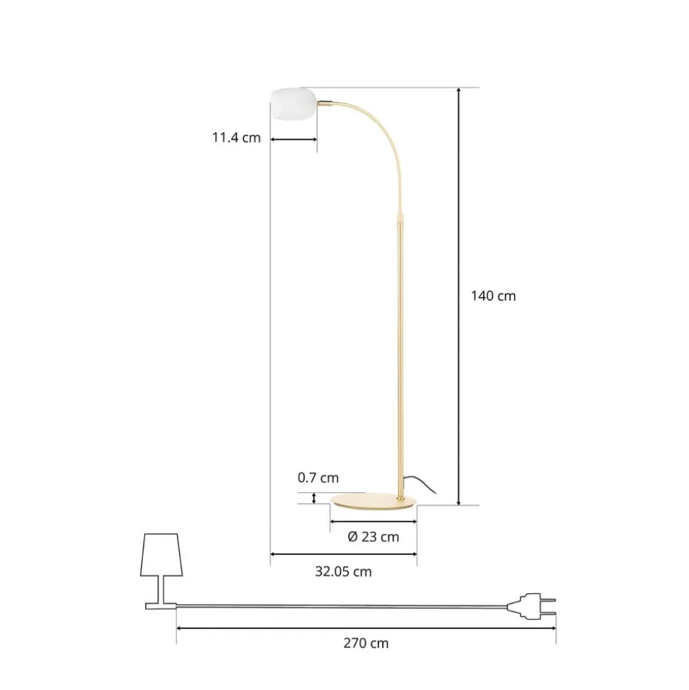 Messingfarvet Taylan gulvlampe med mælkefarvet lampeskærmDenne gulvlampe bringer ikke kun lys ind i mørket, men forbedrer også dekorativt dit interiør. Modellen Taylan kan uden problemer tændes og slukkes med en afbryder, beriger dit personlige indretningskoncept med det attraktive design, som går tilbage til Ingo Thiele, og er messingfarvet. Med denne lampe vælger du en fremragende mærkevarekvalitet fra Lucande. Der kræves pærer med en G9-sokkel til fatningen. Skab en behagelig atmosfære i dit hjem med denne lampe.