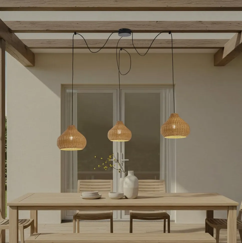 3 lyskilder Taniola hængelampe lavet af rattan – en rustik følgesvend til udendørs brug Den udendørs hængelampe Taniola kombinerer robuste materialer og rustik charme for at skabe et belysningselement, der forvandler udendørs områder som terrasser og balkoner til indbydende tilflugtssteder. Den 3 lyskilder store hængelampe er fremstillet af en kombination af rattan og jern og præsenterer sig i en harmonisk farvekontrast af beige og sort, som udstråler naturlighed og elegance. Med en kapslingsgrad på IP44 er lampen optimalt beskyttet mod indtrængen af fremmedlegemer og vandsprøjt, hvilket gør den til en pålidelig lyskilde i udendørs områder. Muligheden for at regulere lysstyrken via en ekstern dæmper (medfølger ikke) giver ekstra fleksibilitet til at skabe den ønskede atmosfære – fra blødt dæmpet til klart og lyst.