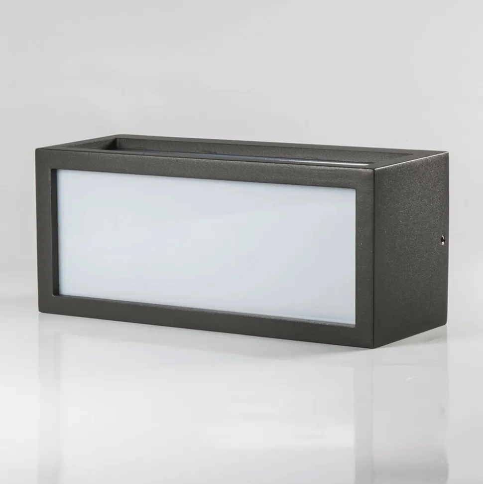 Rektangulær Tame udendørs væglampe med tresidet lysudslip og robuste polykarbonatindsatser Denne udendørs væglampe med kapslingsgrad IP54 giver ikke kun et smukt og jævnt lys takket være de opalhvide indsatser, men har også et diskret stilrent og moderne look med sin grafitgrå ramme, så den kan bruges til at skabe smukke accenter på facaden af et hus eller anden form for murværk. Det er en stor fordel, at indsatserne er lavet af robust polykarbonat, da det er langt mindre skrøbeligt end glas, og udendørs er et armatur udsat for vind og vejr, som ikke har den store effekt på dette materiale. Den udendørs væglampe er udstyret med en E27 sparepære på op til 18 W, så strømforbruget kan holdes lavt.
